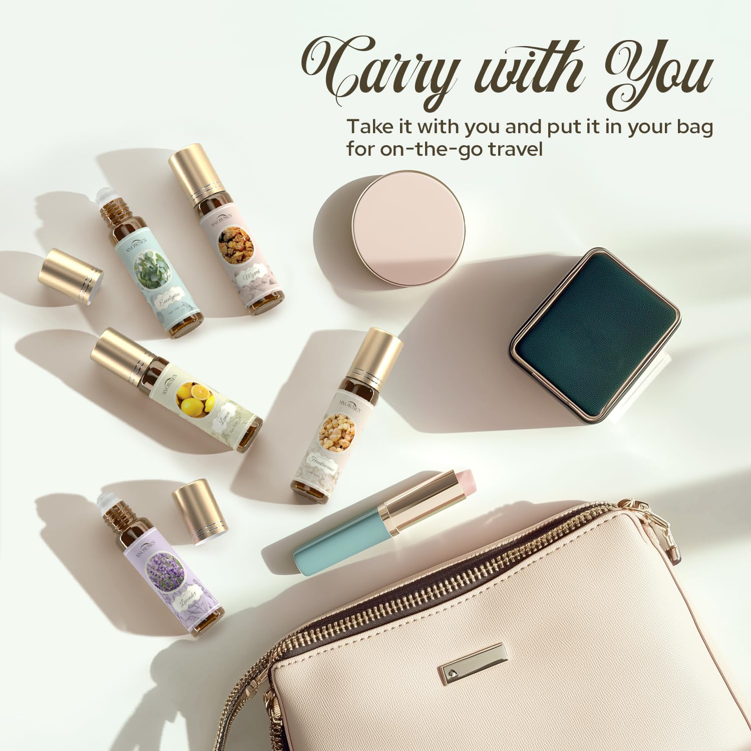 - Essential Oil Roll On Set: This essential oil roll on set includes 6x10ml bottles, each with a convenient glass rollerball for easy, targeted application. The set features Lavender roll on oil, Peppermint roll on oil, Frankincense roll on oil, Eucalyptus roll on oil, Lemon roll on oil, and Myrrh roll on oil.