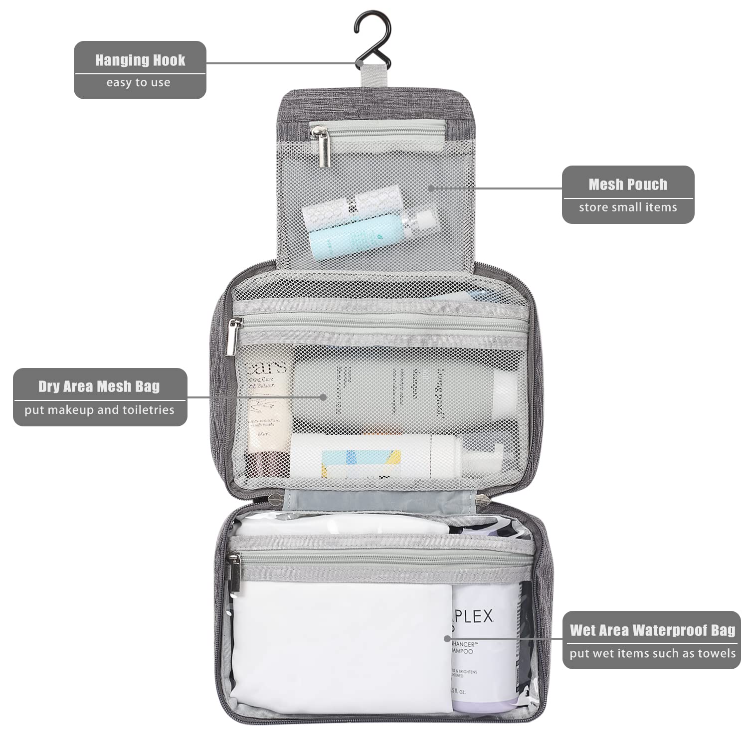 - Hanging Toiletry Bag: Built-in hook allows hanging the toiletry kit from towel rack, coat hook or whereever is available, making your toiletries and cosmetics displayed well for quickly find what you need and save time