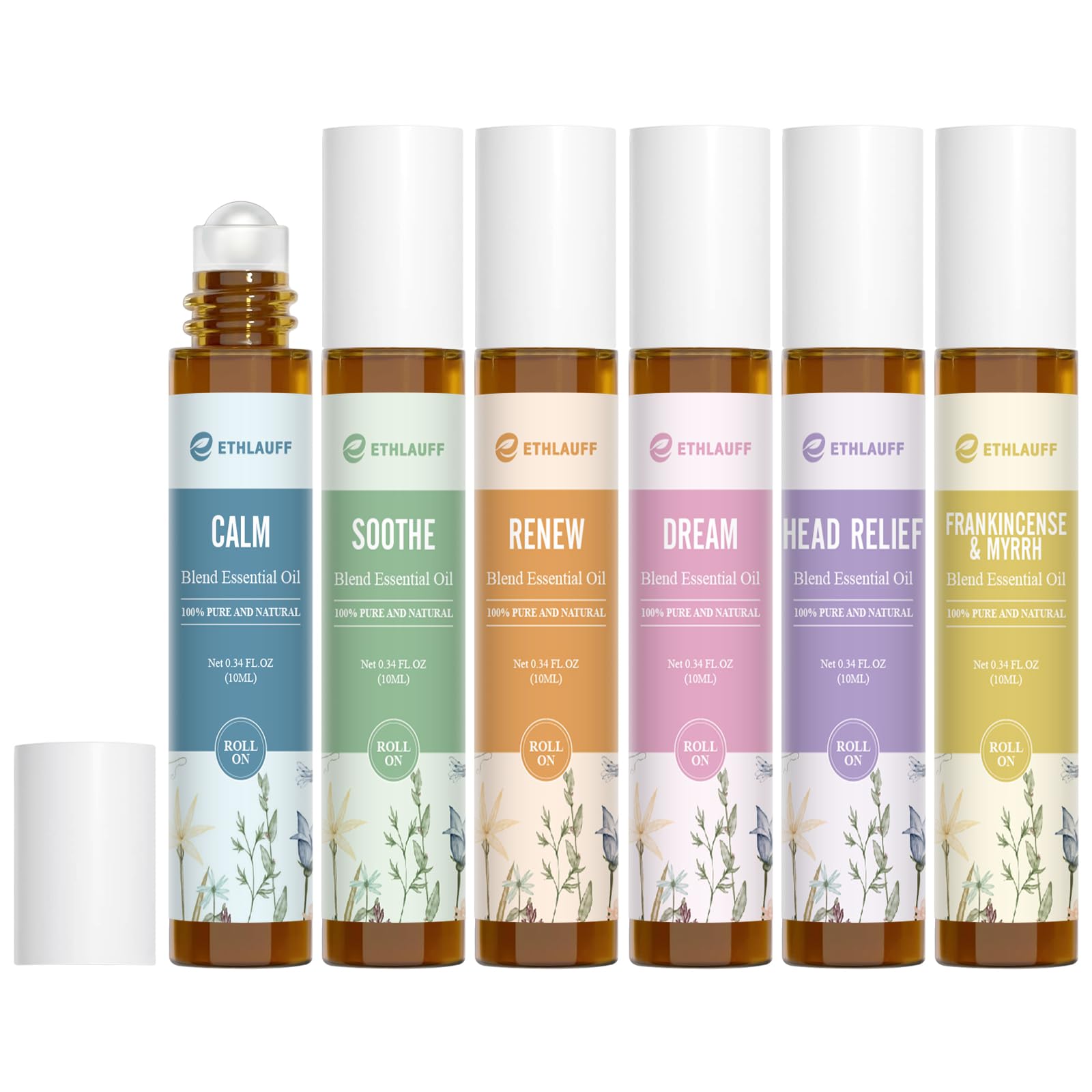 - Versatile Aromatherapy Solutions: This set includes six expertly crafted blends—Calm, Renew, Dream, Soothe and Head Relief, Frankincense & Myrrh—designed to address various needs from stress relief to enhancing your mood, perfect for massage, body care, or home use.