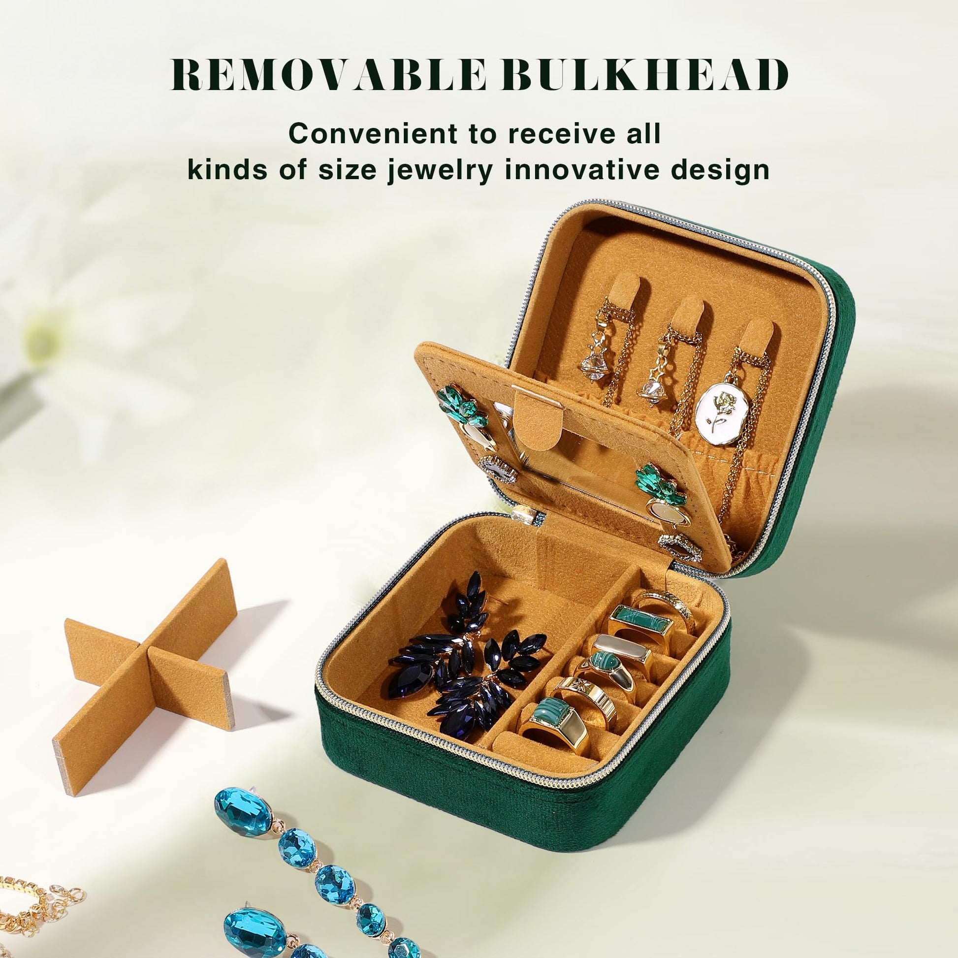 - High Quality Materials - The jewelry case is made of high-quality luxurious emerald velvet that can well prevent your jewelry from scratching, sturdy and durable. Comes with a secret earring compartment and a built-in compact mirror