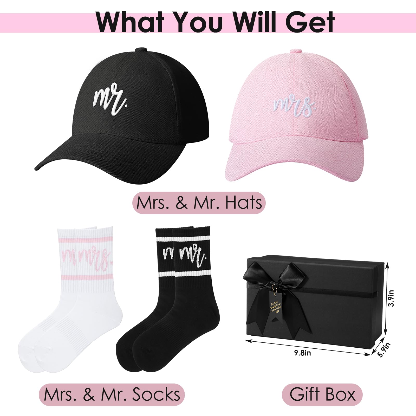 - Wedding Gift Set: this 5 piece gift set includes 2 finely embroidered baseball caps and 2 pairs of quality crew socks each adorned with distinct "Mr" and "Mrs" designs, and there is also a gift box, these accessories make for a stylish and fun way to celebrate your union on special occasions or casual outings