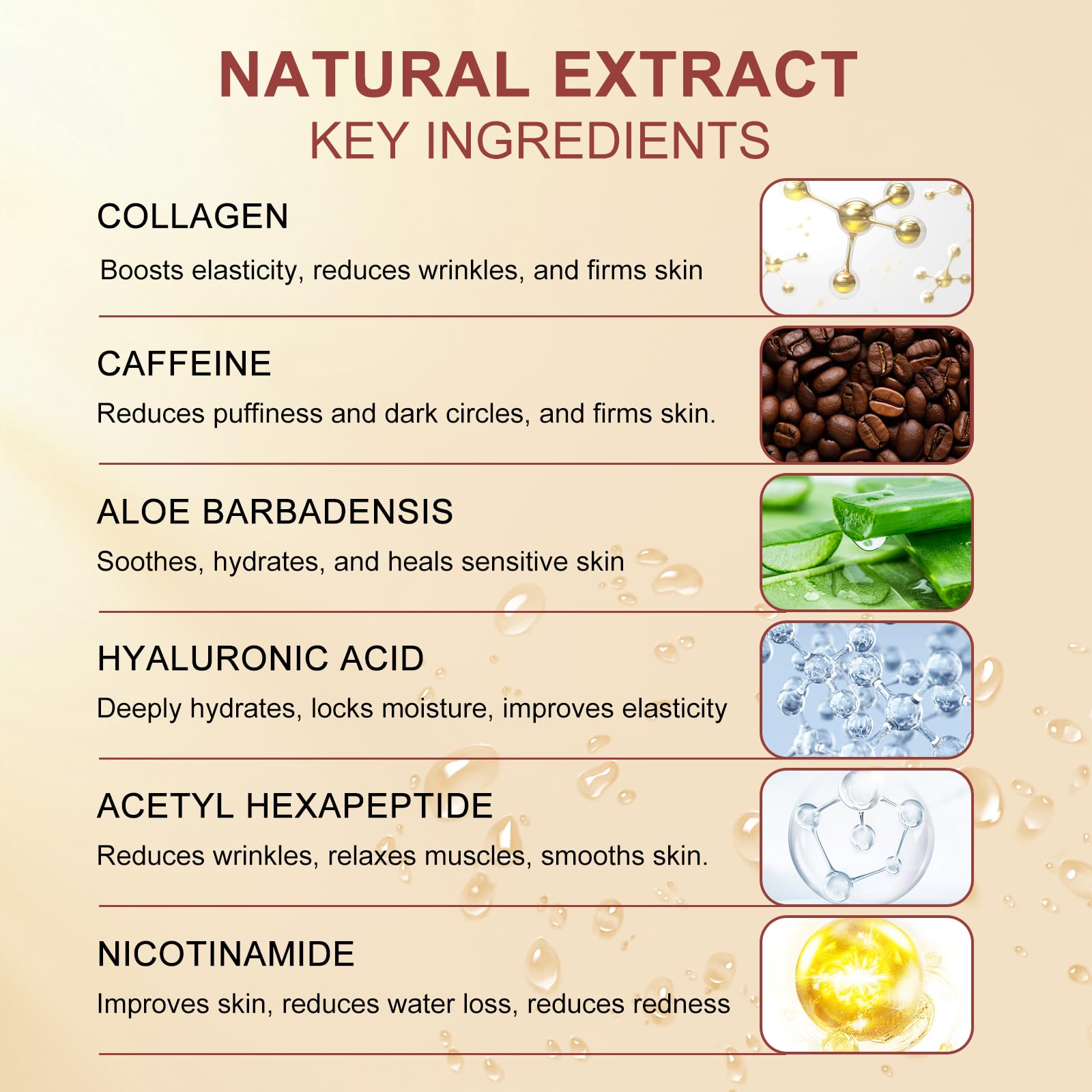 - [Effective Eye Treatment] - LAVONE eye mask rich in caffeine extract, collagen, hyaluronic acid, aloe and few natural extracts. Eye patch for dark circles and puffiness. Enhances skin for a luminous bare-faced glow, visibly Anti-aging, hydrates and nourishes skin. Improves texture, reduce wrinkles, eye bags and fine lines. Leave skin smooth, soft, refresh, brighten and grow. Keep your eyes young!