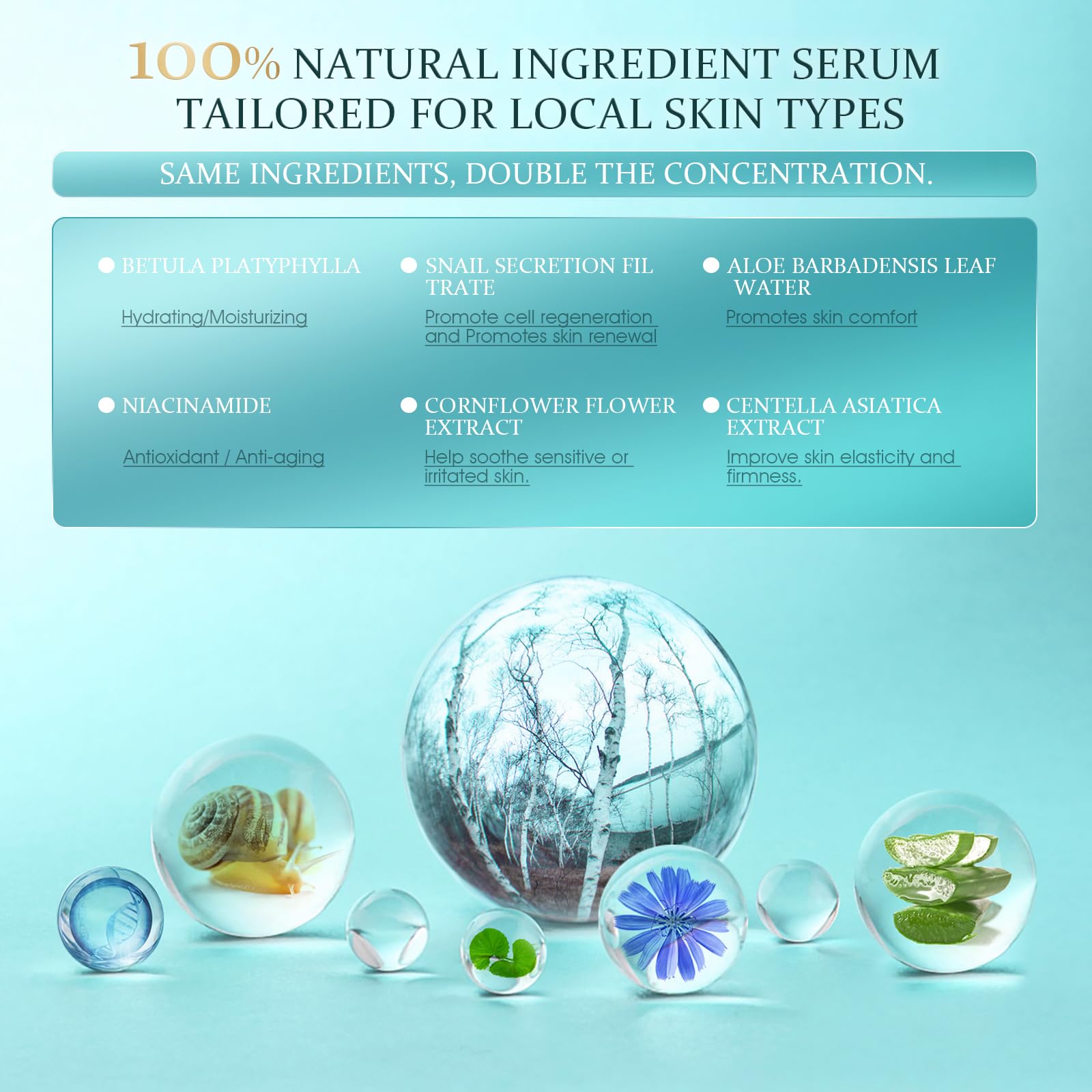 - Natural and Powerful Ingredients: Our face serum formula includes birch sap, which hydrates and enhances the skin, reducing dark spots, and snail secretion filtrate, which repairs and smooths the skin. Aloe barbadensis leaf water soothes and calms the skin, reducing redness, while niacinamide minimizes excess oil, tightens pores, and enhances skin vibrancy.