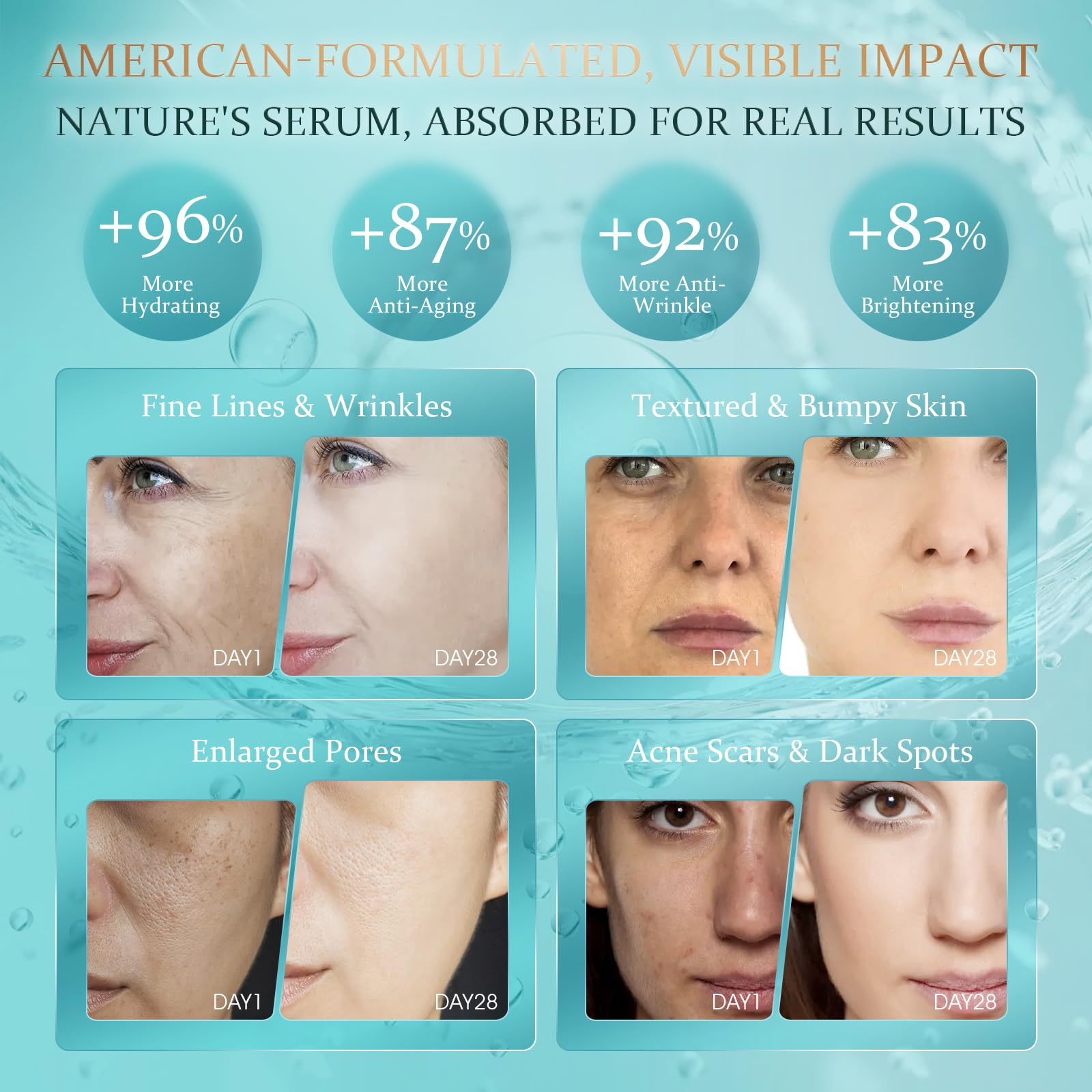 - Visible Results: Users have reported significant improvements with 92% noticing a reduction in the appearance of wrinkles and 95% seeing a significant hydration. The serum enhances skin strength and moisture, giving a radiant and youthful appearance.