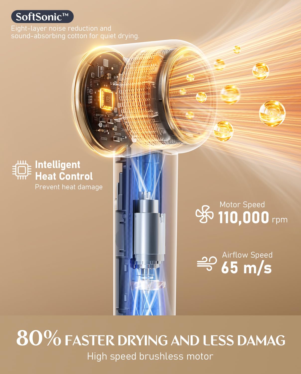 - 80% FASTER DRYING: SonicDry Tech with 110,000 RPM brushless motor delivers 65 m/s airflow that dries hair effortlessly