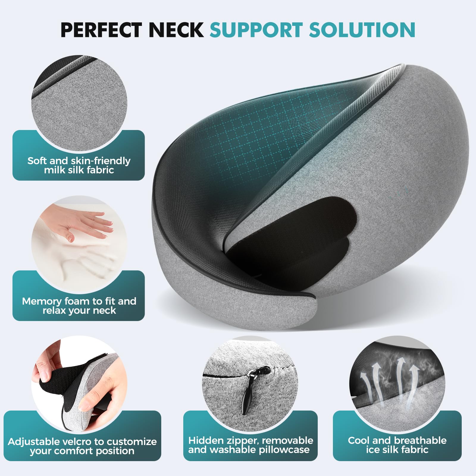 FIOGIKO Travel Neck Pillows for Airplanes - 360° Ergonomic Memory Foam Travel Pillow - Relief Neck Pain with Breathable Support for Long Flights, Car, Train & Office Use - Adults & Kids