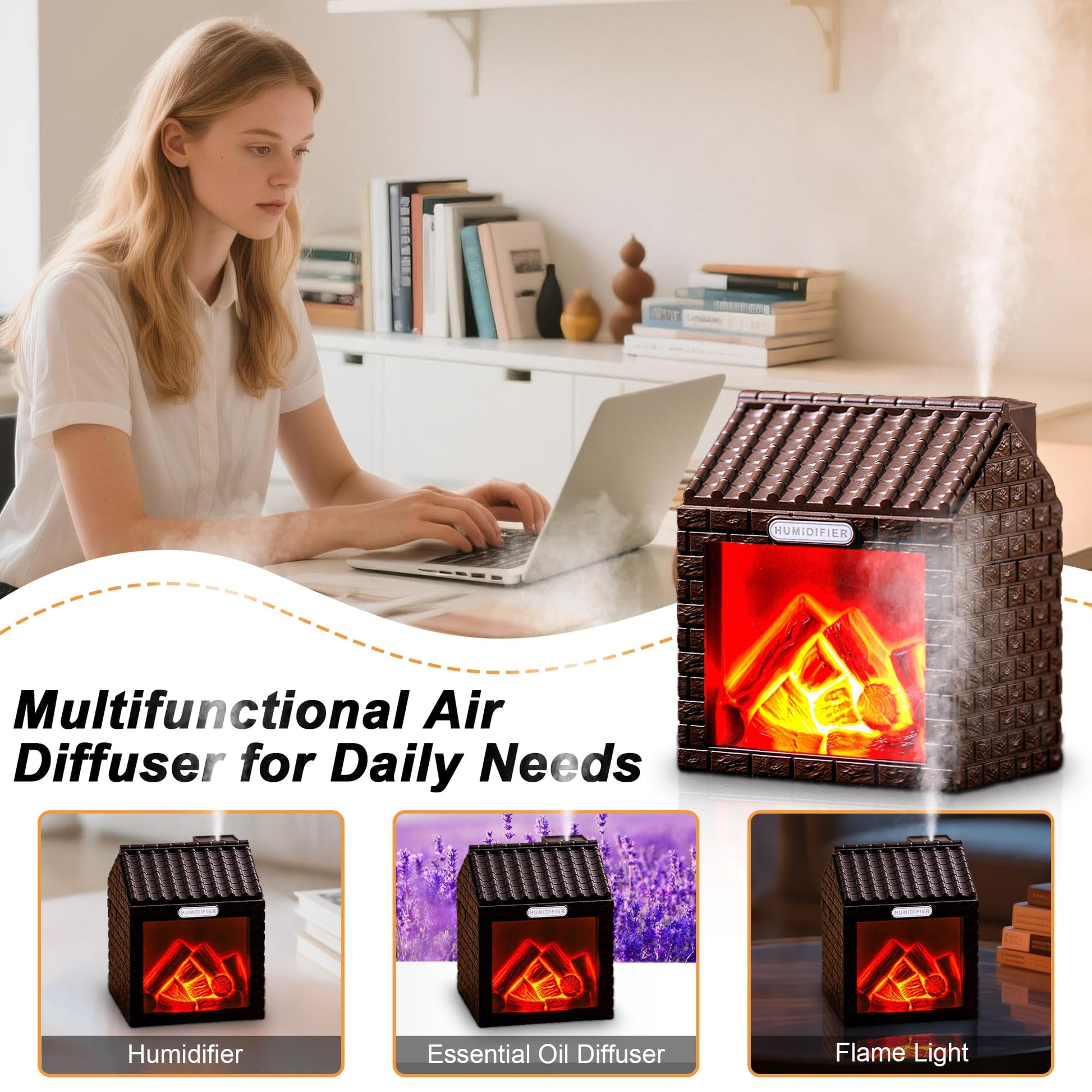 This is more than just an fireplace humidifier—it’s a multifunctional humidifier that combines a night light, humidifier, and scent diffuser in one.