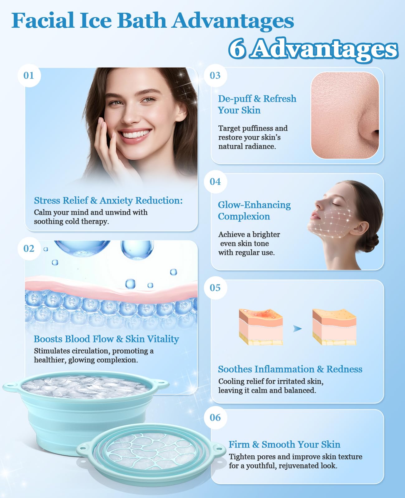 - 【Step-by-Step Cold Therapy for Glowing Skin】simply collapse the bowl, fill the built-in ice tray with water, chill in the refrigerator, freeze, then open the bowl and pour in water. Immerse your face for a soothing, full-face cold plunge that tightens skin, reduces puffiness, and promotes glowing skin.