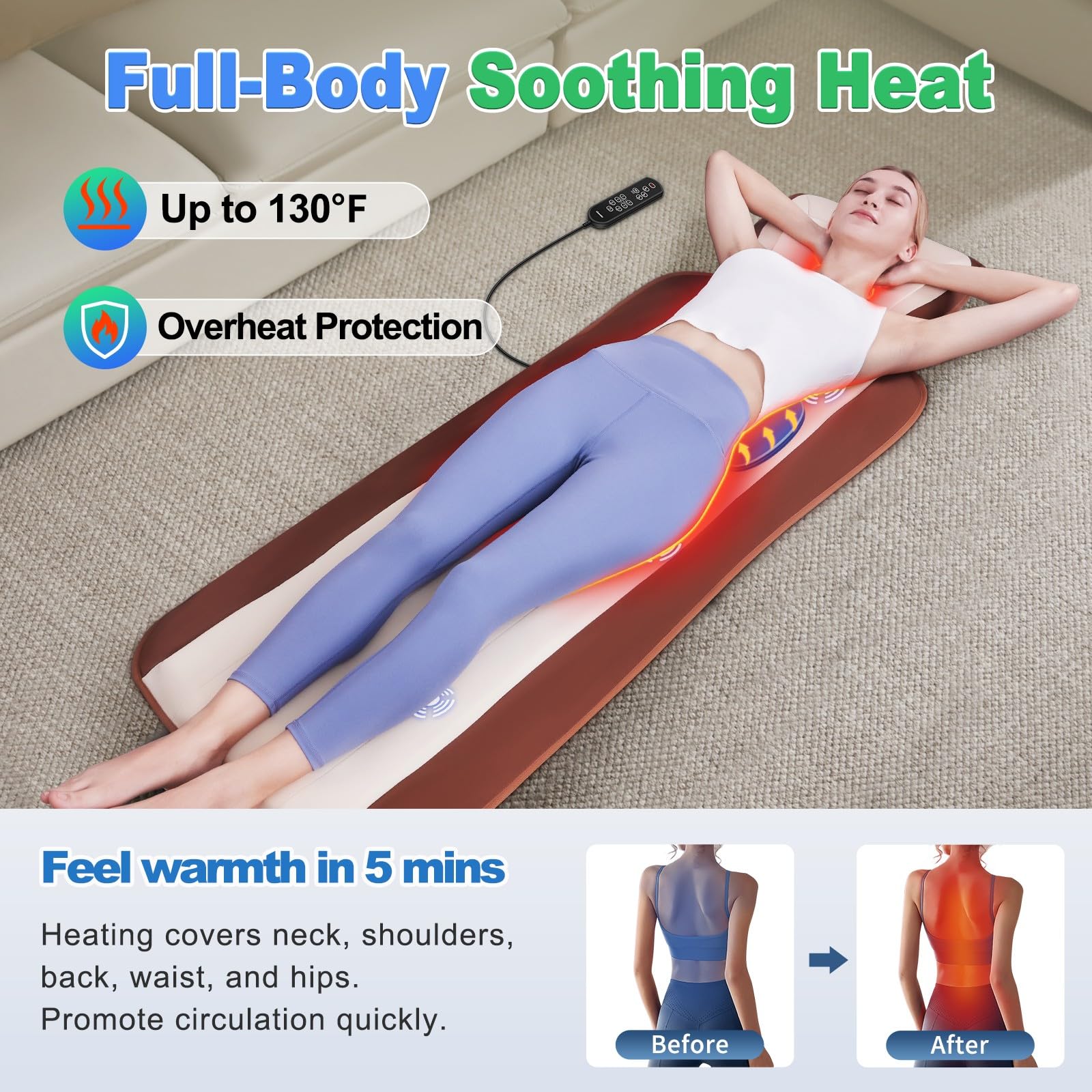- 6-In-1 Full Body Massage Mat: This full body massage mat with heat, combines vibration massage, 3D waist traction, full body heating, it effectively massages your body, quickly relieving stress and fatigue.
