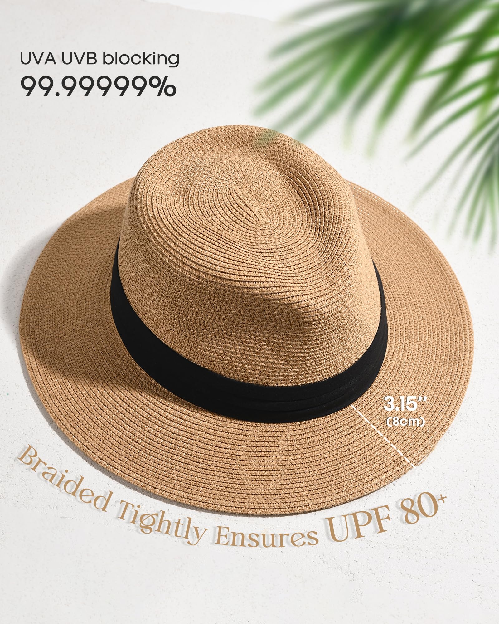 - UPF 80+ Sun Protection & Wide Brim Design:Crafted with tight braided paper straw and polyester, this straw hat offers UPF 80+ defense against harmful rays.Its 3.15-inch brim shades faces and necks, making it a beach vacation essential for summer adventures like boating, gardening,or traveling