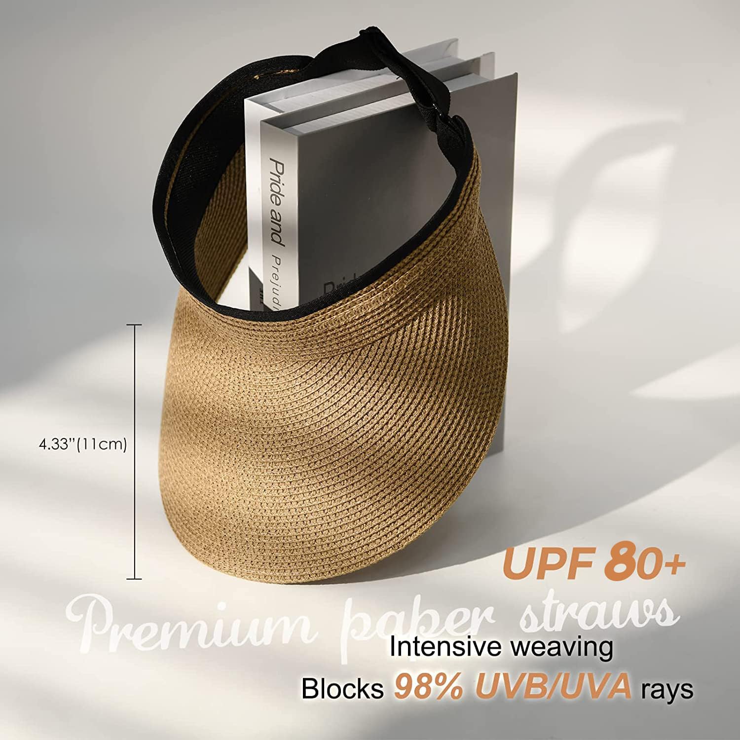 - Wide brim Straw Visor: The length of the womens visor's brim is 13cm, and the longer brim provides you with more comprehensive UV protection; Women's sun hats have UPF 80+ sun protection function; The straw beach hat helps to cover your face, thereby protecting your skin from Ultraviolet rays damage and may prevent age spots;