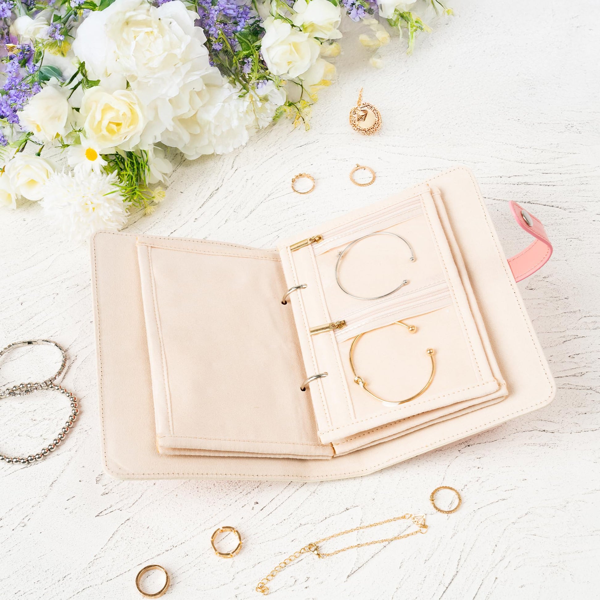 FurUlixty Jewelry Travel Organizer Case -5 Pouch Jewelry Roll for Necklaces, Rings, Earrings Jewelry Storage Ring Binder PU Leather for Women (Beige & Pink)