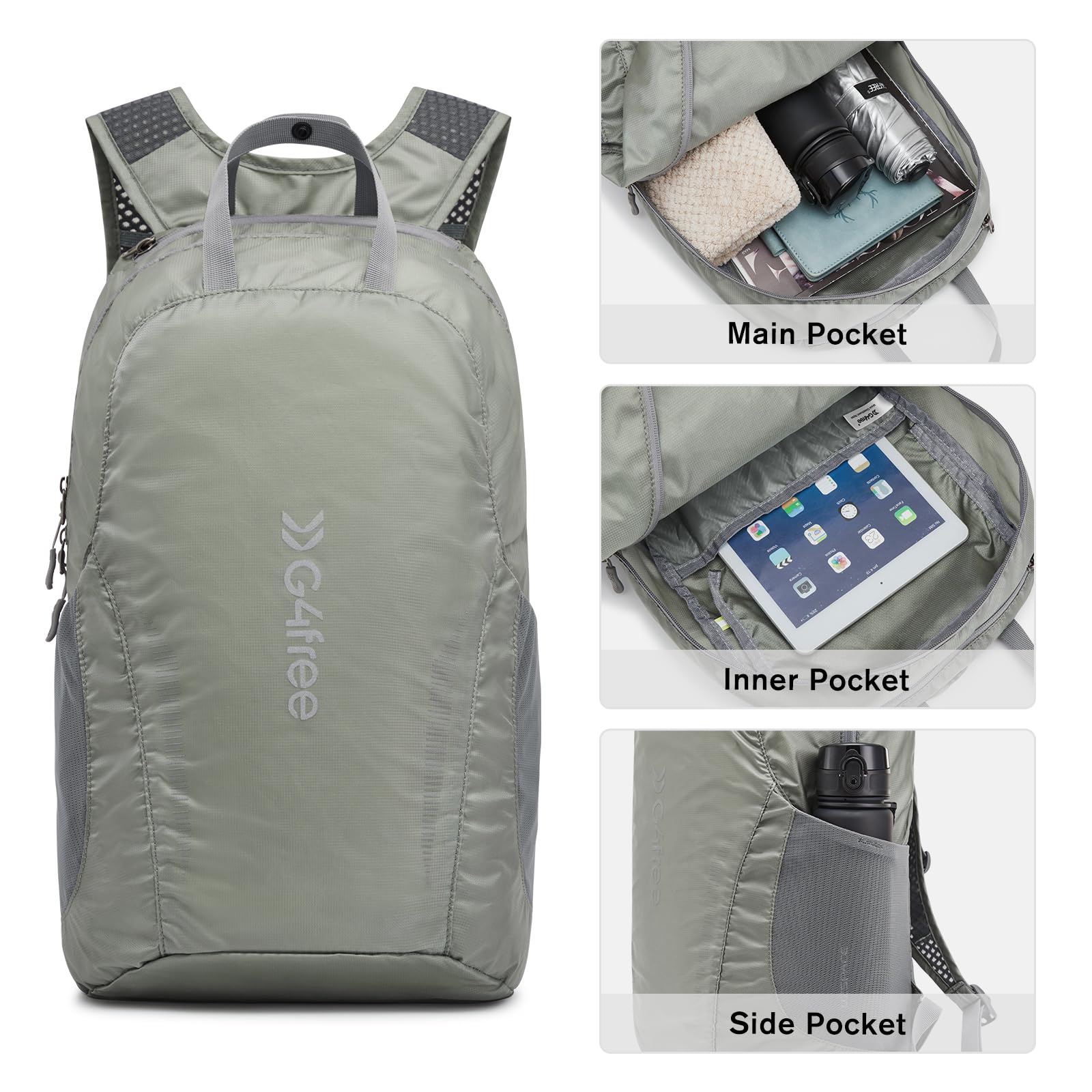 G4Free 25L Lightweight Hiking Backpack Packable Foldable Sport Travel Daypack Water Resistant for Women Men(Grey Green)