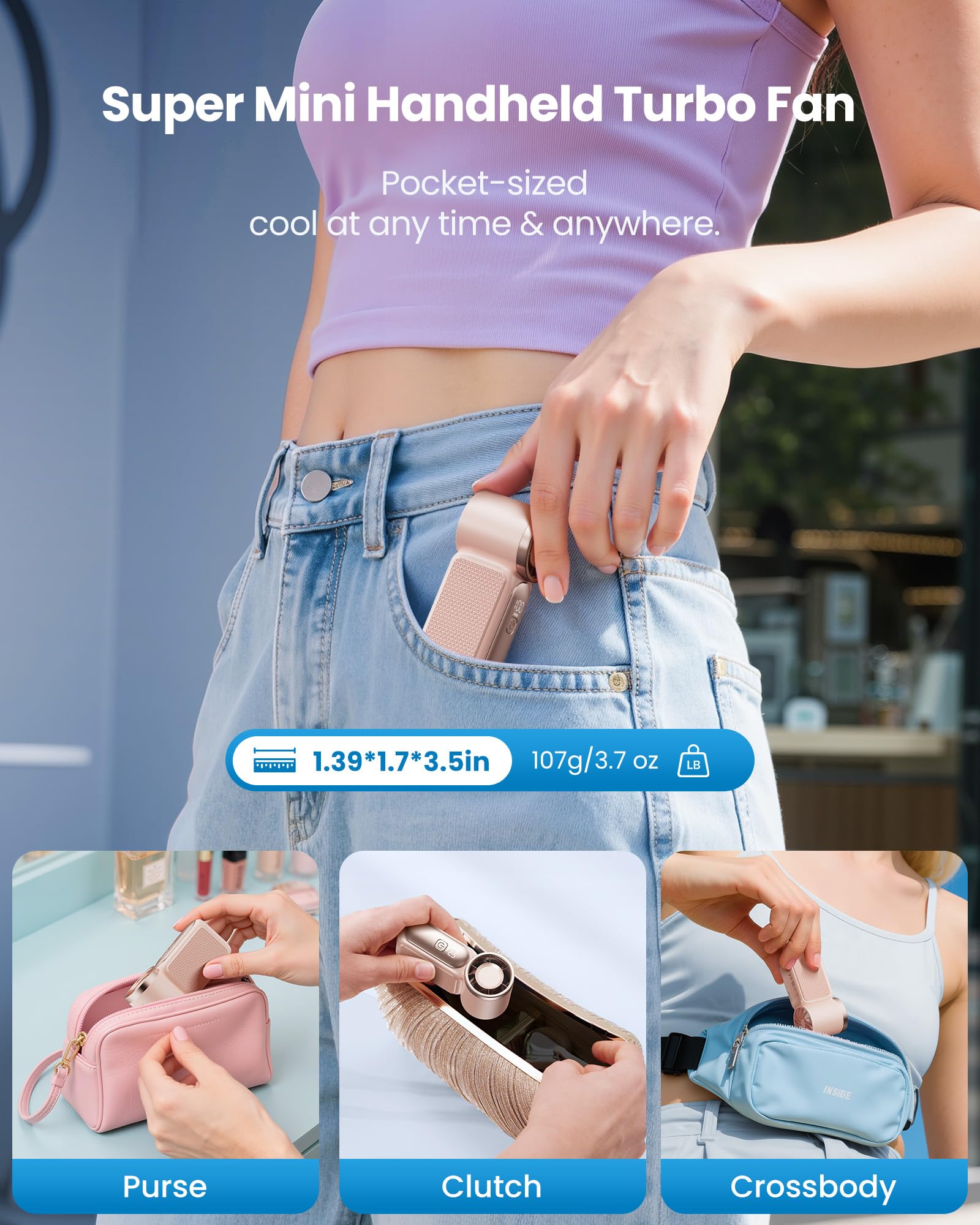 - Ultra-Portable & Truly Pocket-Sized Mini Fan: Weighing only 107g, this ultra-compact personal fan fits effortlessly in your pocket, purse, or clutch. Includes a detachable lanyard for totally hands-free wear—ideal for travel, commutes, and outdoor use. A true portable mini fan that goes everywhere you do