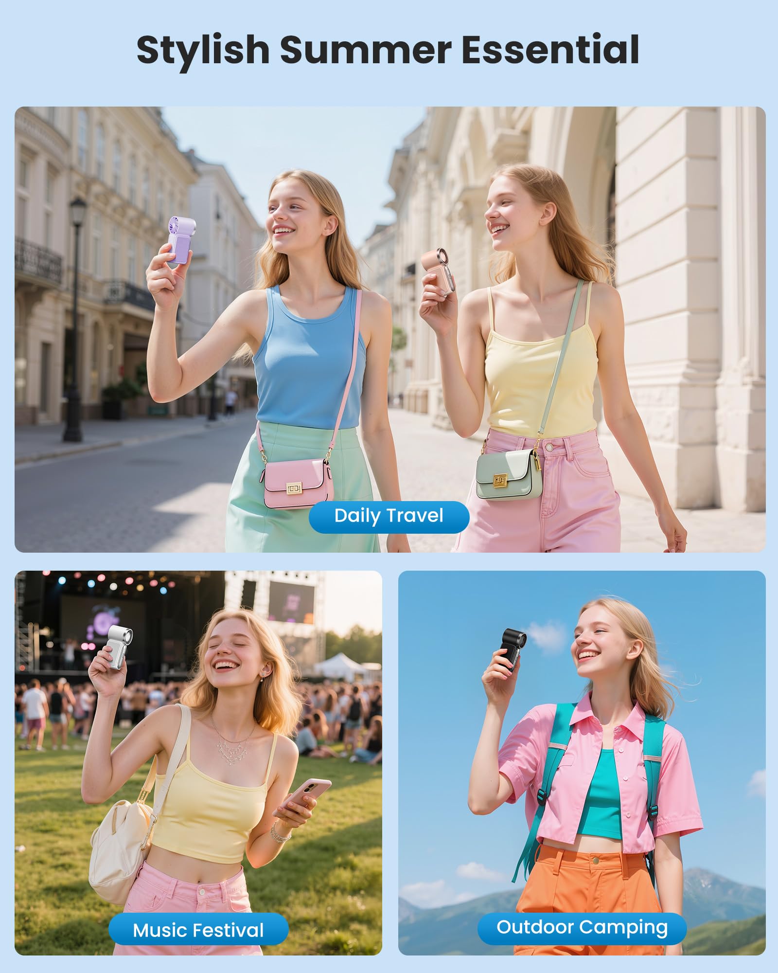 - Makeup-Safe & Face-Friendly Personal Fan: Gentle yet effective airflow helps keep makeup intact while cooling your face and neck. A must-have mini fan for outdoor events, dates, workouts, or simply beating the heat in style