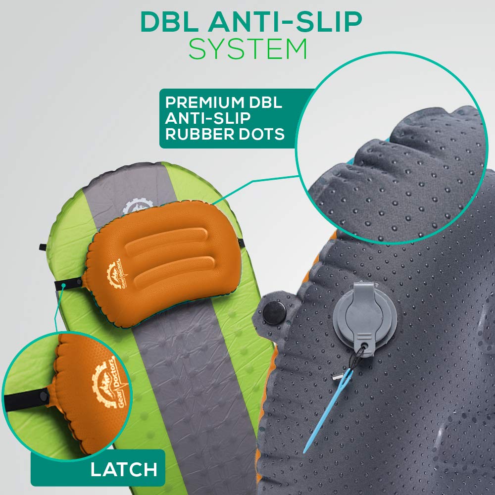 - 𝐃𝐨𝐮𝐛𝐥𝐞 𝐀𝐧𝐭𝐢-𝐒𝐥𝐢𝐩 𝐒𝐲𝐬𝐭𝐞𝐦: Rubber dots at the bottom fabric make Gear Doctors Camping Pillow stable on any Nylon , Polyester or other slippery sleeping pad fabric , If that is not enough you can use the detachable latch to lettarly tie the pillow to your sleeping pad , or even any car/ office chair , No more sliding noises or waking up to readjust your pillow