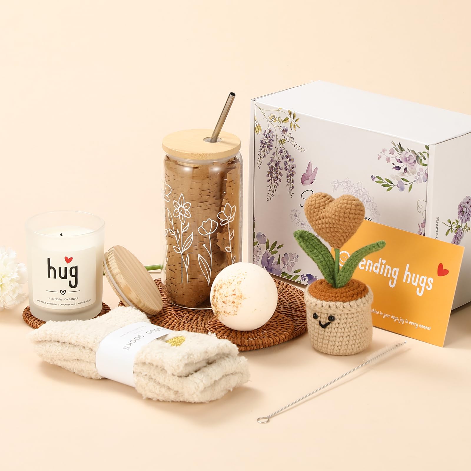 - 【7-Piece Lavender-Infused Self-Care Collection】:Includes: 16oz wildflower coffee mug, handwoven heart-shaped succulent, lavender soy wax candle, artisanal soap, ultra-soft socks, "Sending Hugs" greeting card, and elegant gift box. Every item promotes relaxation and positivity.