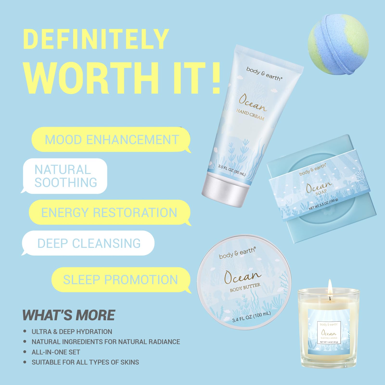 - Fresh Ocean Scent: Body & Earth bath spa gift set infused with a relaxing ocean scent, these products can put you into a state of relaxtion as if you were at the beach