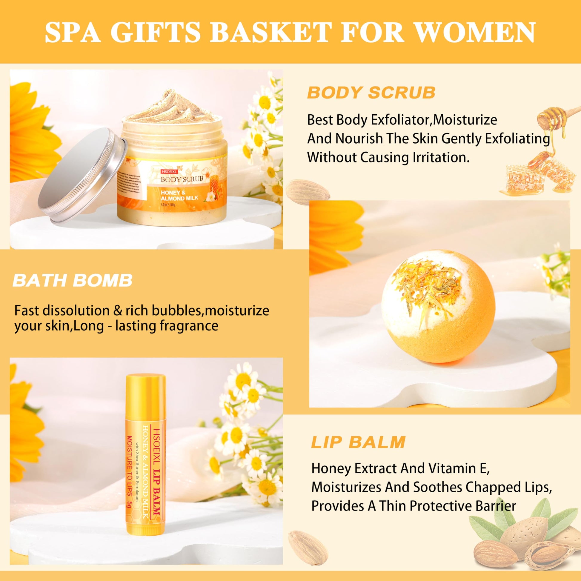 - HONEY ALMOND & MILK SELF CARE GIFT SET: Gently crafted with fragrances of warm almond milk and honey. This tropical scent creates a delightful aroma. Almond Milk & honey is extremely moisturizing and hydrates even the driest of skin. Rich in Vitamin E and Shea Butter to protect and keep skin moisturized. This Body Gift Basket Can Let your sense be enveloped by its charming embrace. Sulfate & Paraben Free, Cruelty-Free.