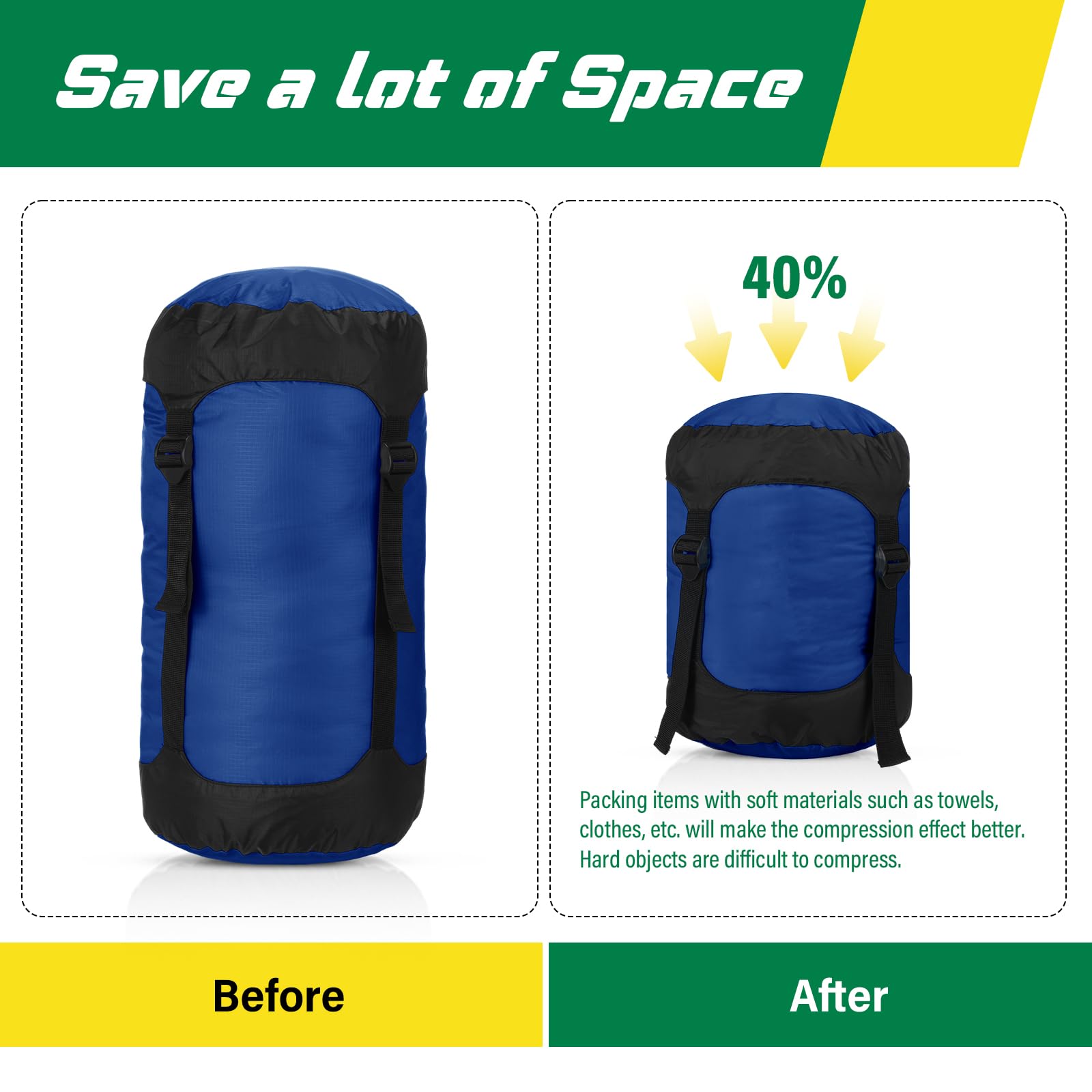 - Made Travel Easier on the Move: waterproof compression sack is equipped with 2 strong compression straps and 2 quick release buckle straps, designed to make your trip more convenient and more organized; Compress your stuff easily and efficiently, space saving, no more bulky, messy luggage, which takes up minimal space in your backpack. Please note: Our products can compress items with soft materials, such as towels, clothes, etc. Hard items are difficult to compress, such as cups, etc