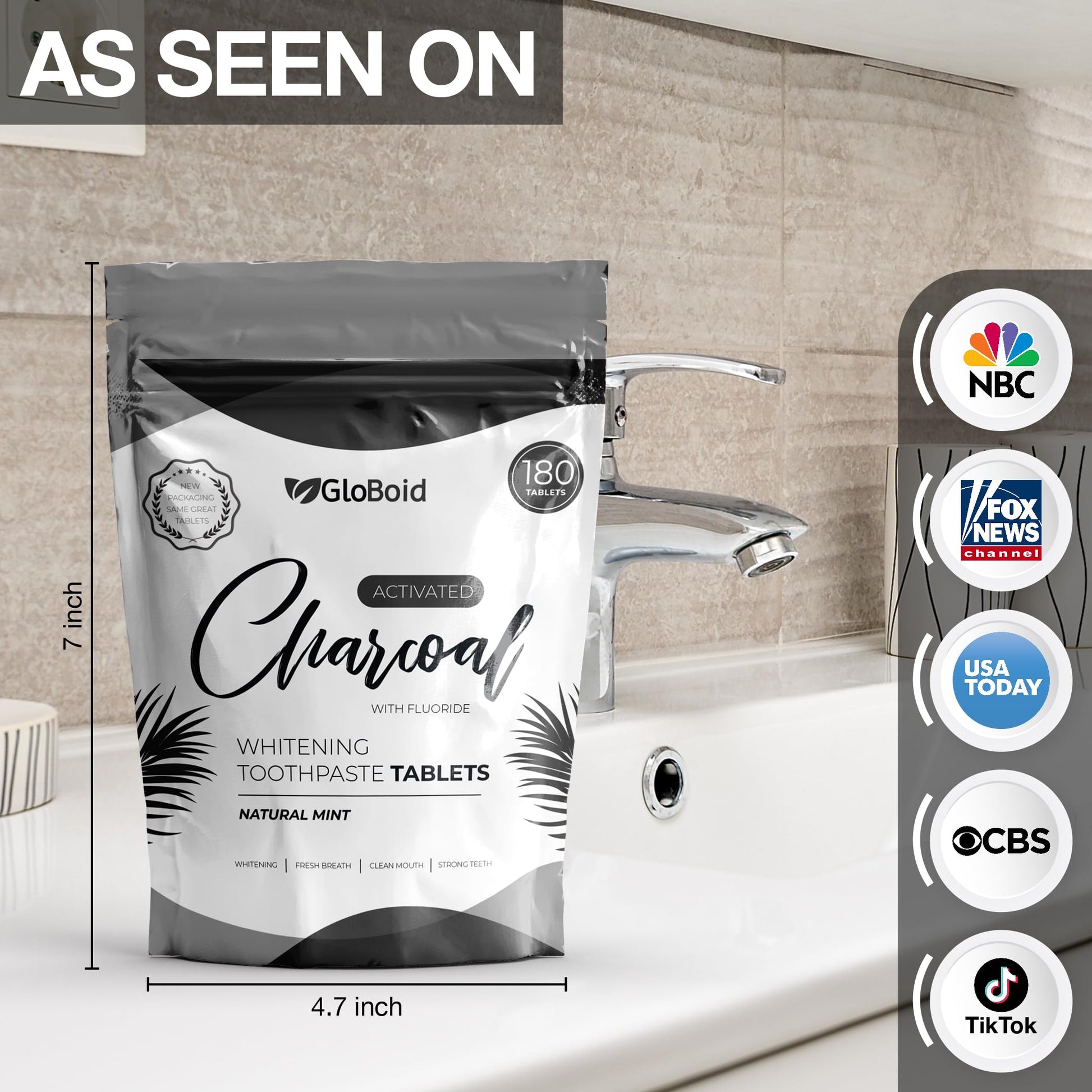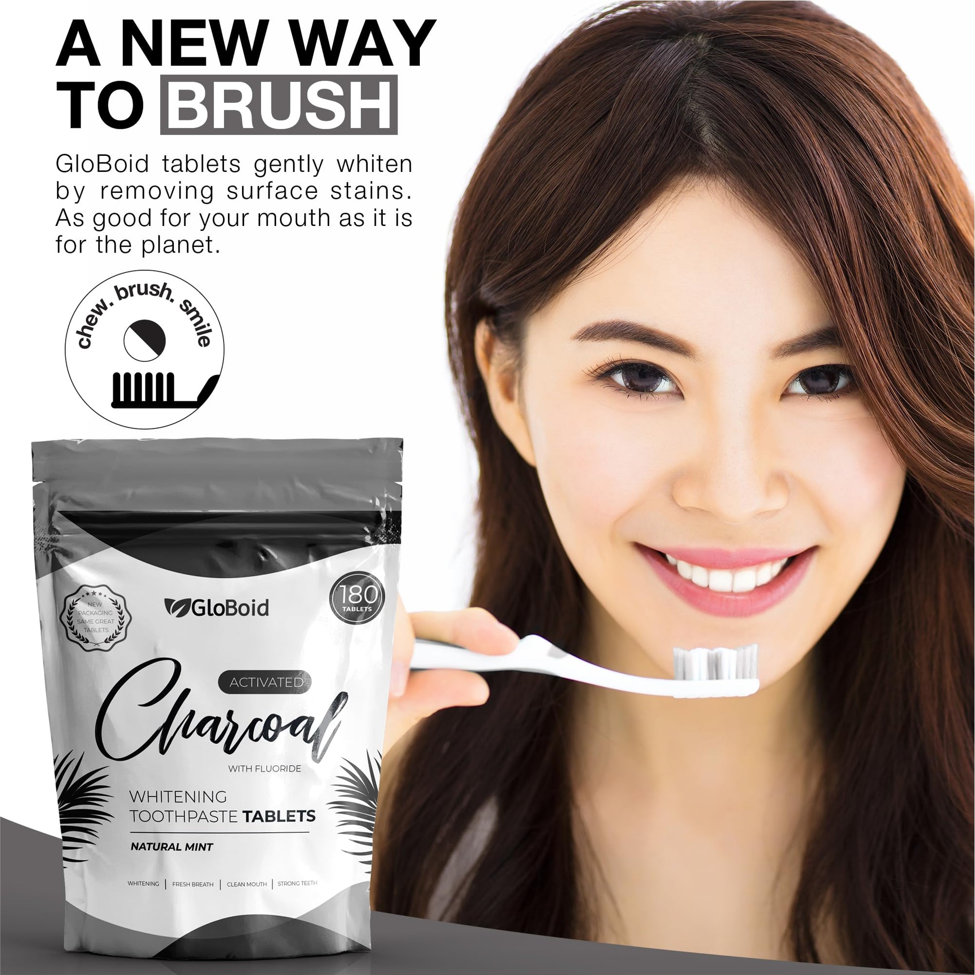 GloBoid Charcoal Toothpaste Tablets with Fluoride Three Month Refill, Zero Waste, Eco Friendly & Plastic Free Toothpaste Tabs, Toothpaste Bites for Travel