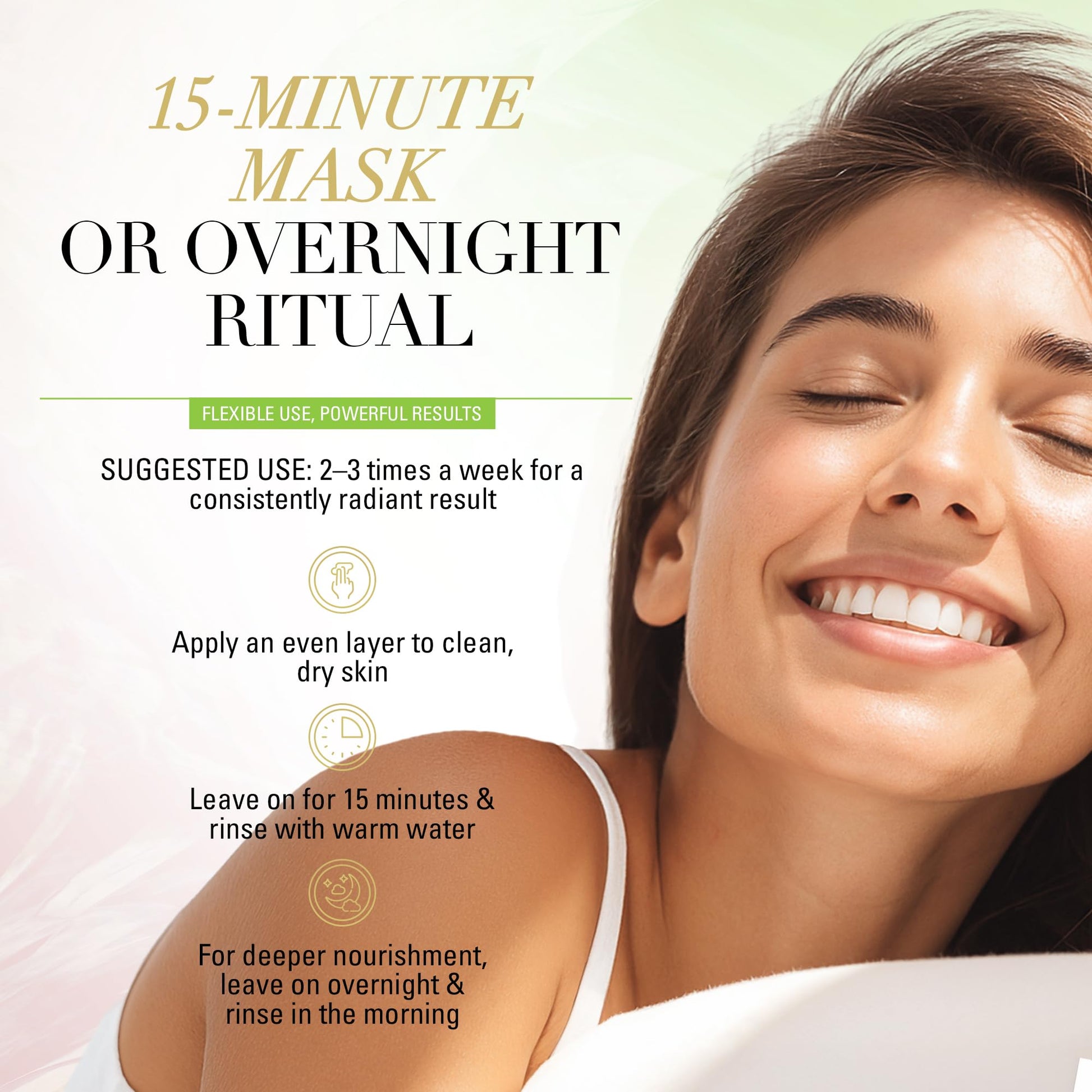 - 15‑MINUTE OR OVERNIGHT RESULTS: Apply for 15 minutes then rinse, or leave on overnight for intensified nourishment; recommended two to three times weekly