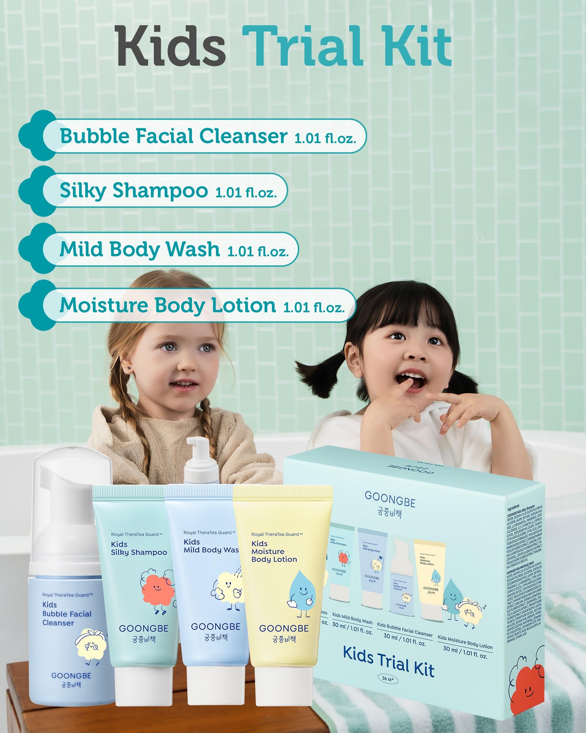 GOONGBE Kids Trial Travel Kit - Korean Low pH Skincare Set with Silky Shampoo, Body Wash, Facial Cleanser & Body Lotion - Silicone-Free Formula for Sensitive Skin, 1.01 fl.oz. each