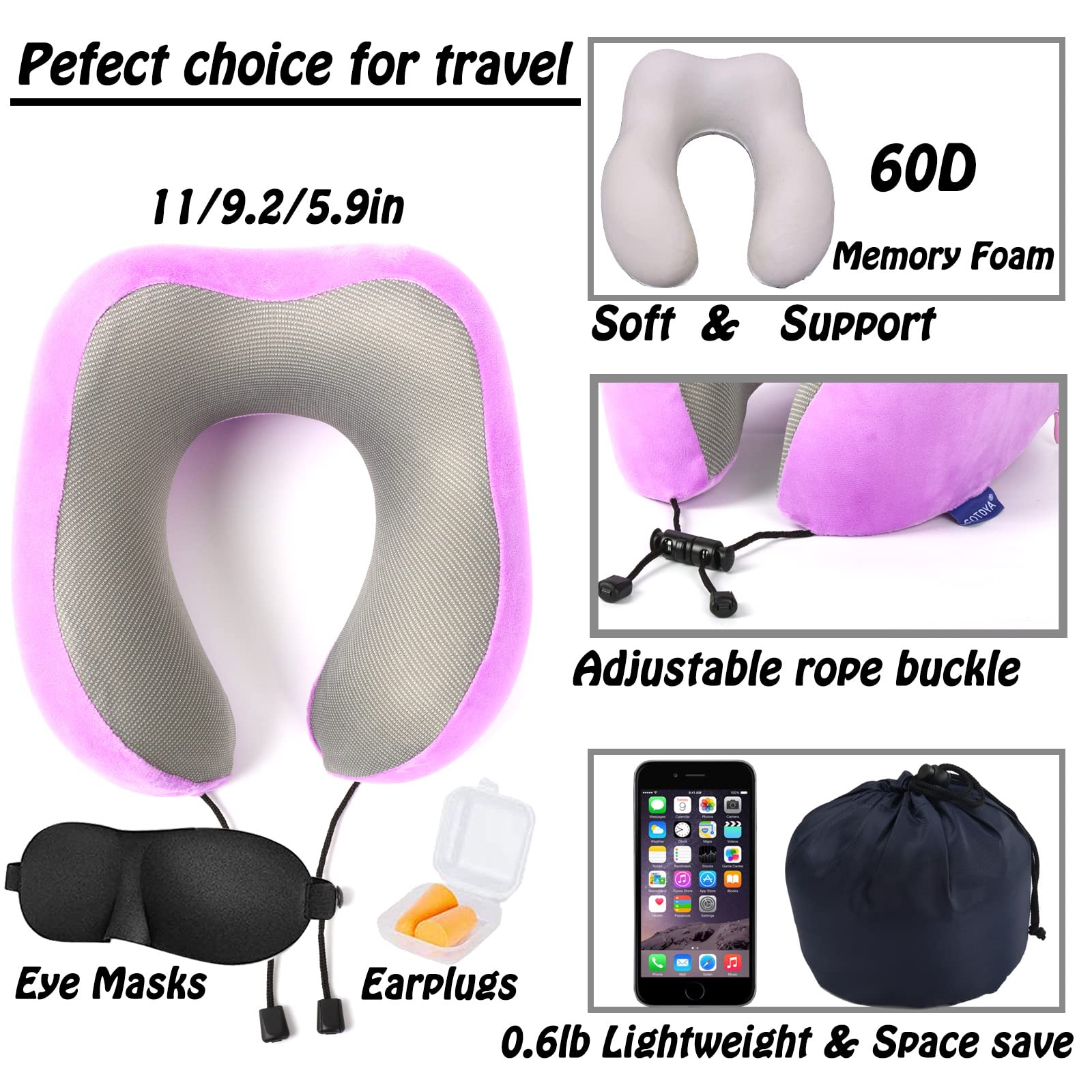 GOTDYA Travel Pillow,Travel Neck Pillows for Sleeping,100% Pure Memory Foam Soft Comfort & Support Pillow for Airplane/Car/Office&Home Rest Use-Violet