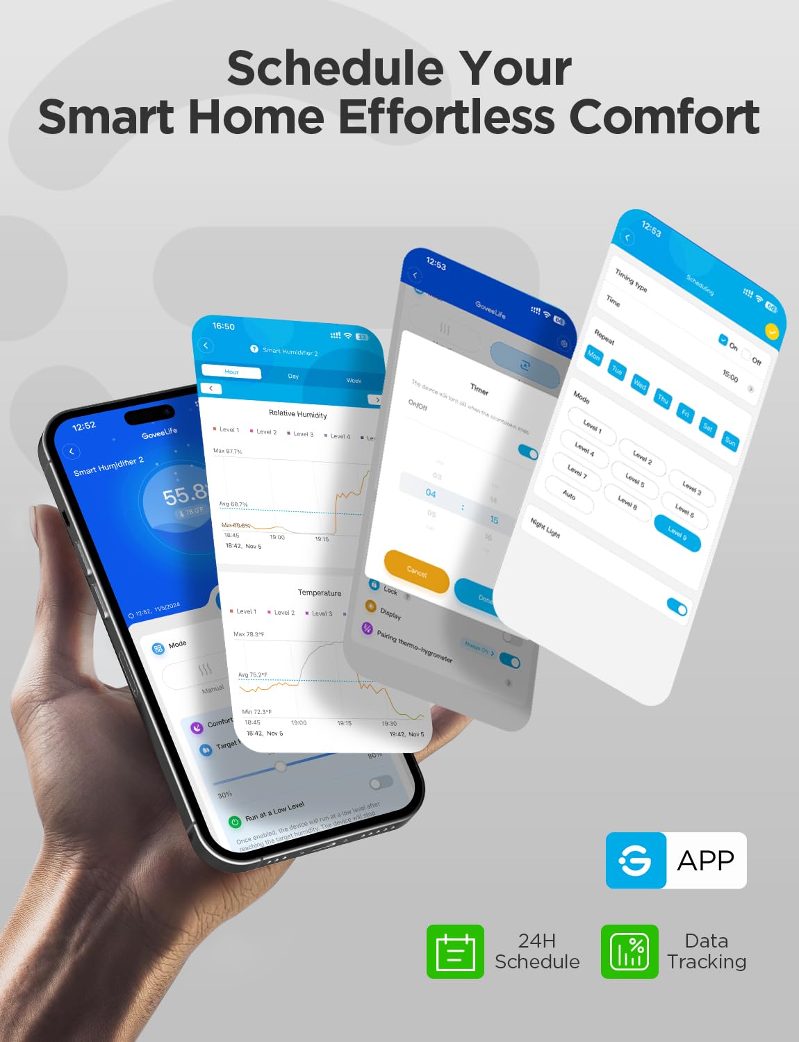 - Auto Mode for Precise Humidification: Built-in high-precision sensor combined with auto mode allows you to set and maintain the bedroom in the ideal humidity range, keeping you comfortable all winter. Connect GoveeLife Thermo-Hygrometer to maintain more precise humidity control and more convenient humidity calibration. (Thermo-Hygrometer not included.)