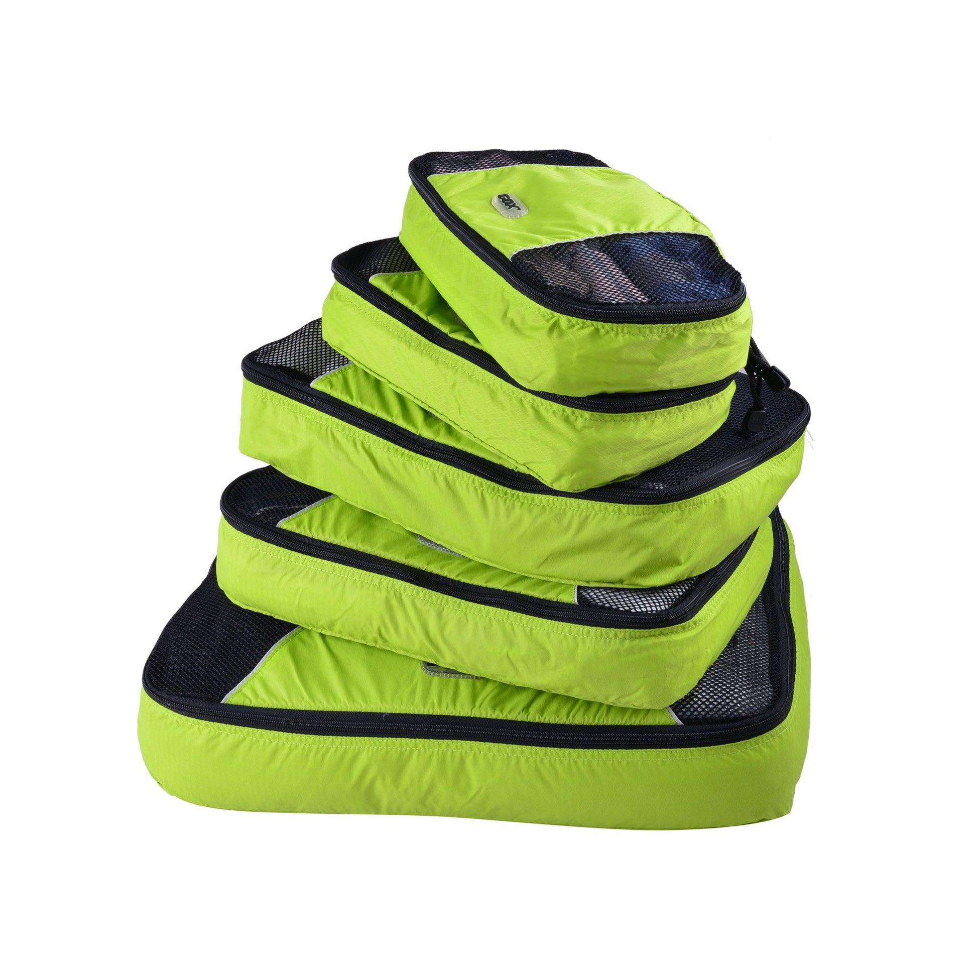 - 5 Packing Cubes: 1 Large (17.5" x 13.6" x 4.13") 2 Medium (14.6" x 9.8" x 2.95") 2 Small (11" x 6.7" x 2.95")