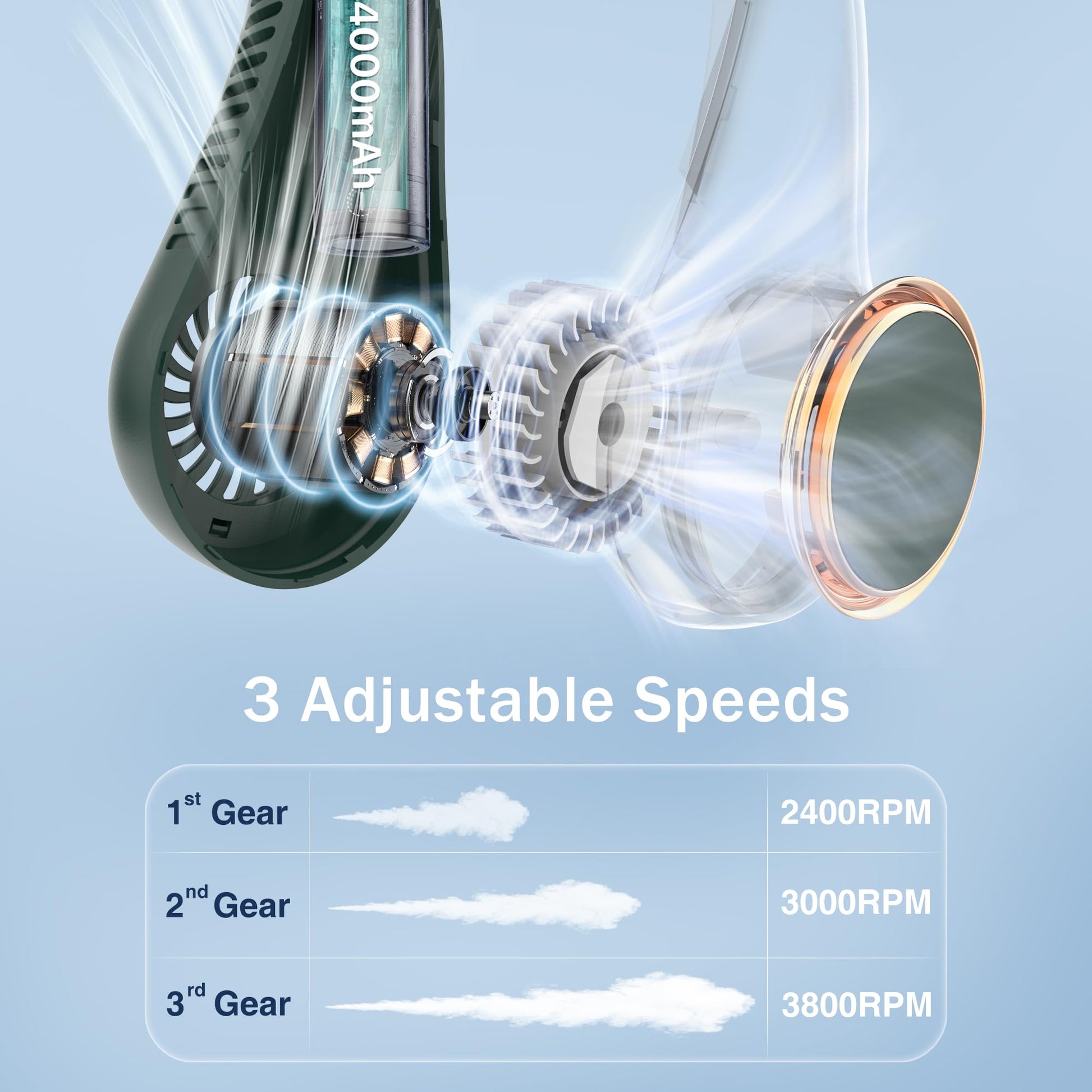 - 【3 Adjustable Speeds & long-lasting Use 】 Equipped with 3 adjustable speeds, the neck fan offers customizable airflow for your ultimate comfort. The built-in 4000 mAh battery ensures long-lasting use, while the one-button control makes it easy to switch between light and blow speed.