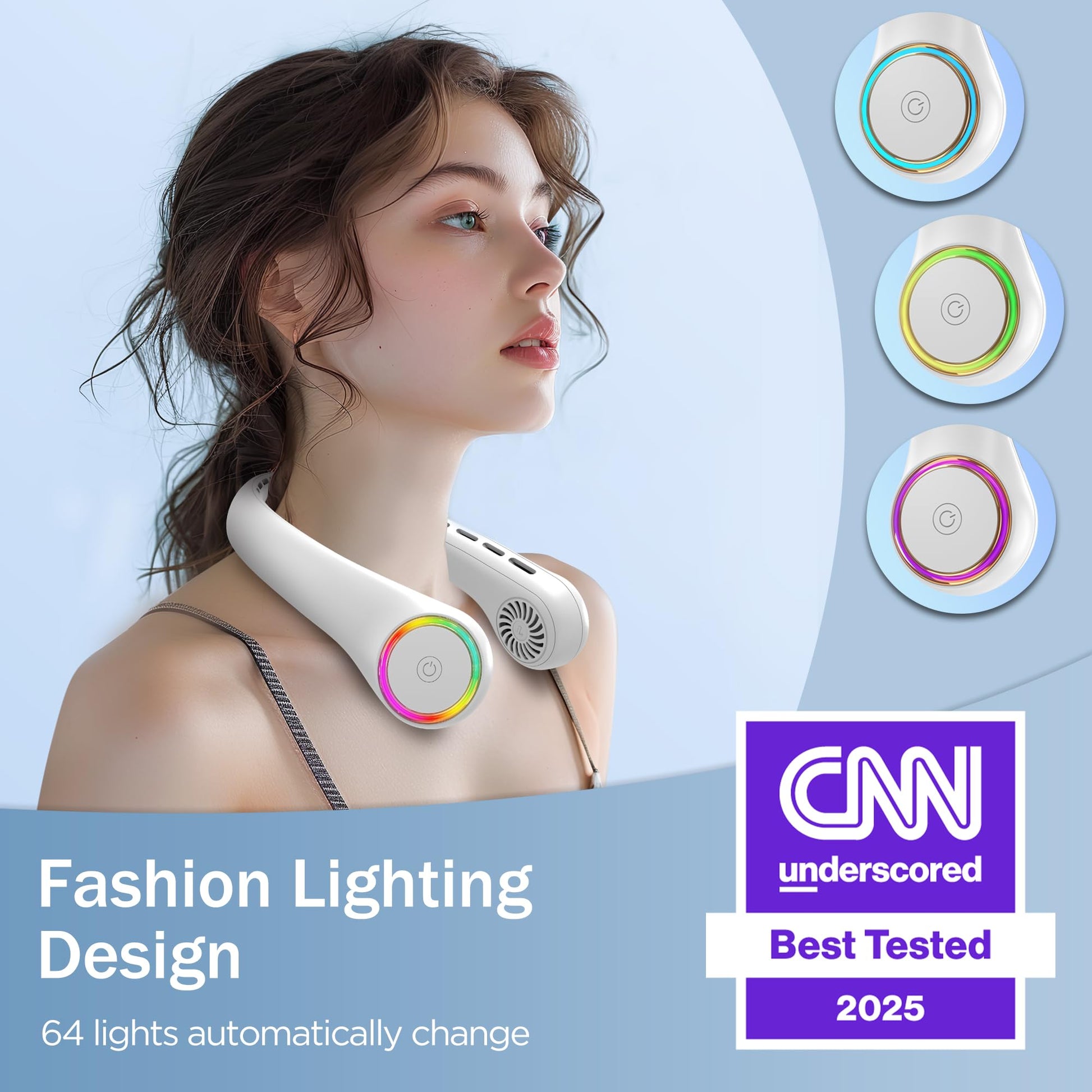 GULAKI Portable Neck Fan, Personal Fan with 4000mAh Battery, Rechargeable Neck Fan with 3 Speeds and 64 Cool Lights, Birthday Gifts for Men Women Mom Dad, Hands Free Cooling fan for Summer(White)