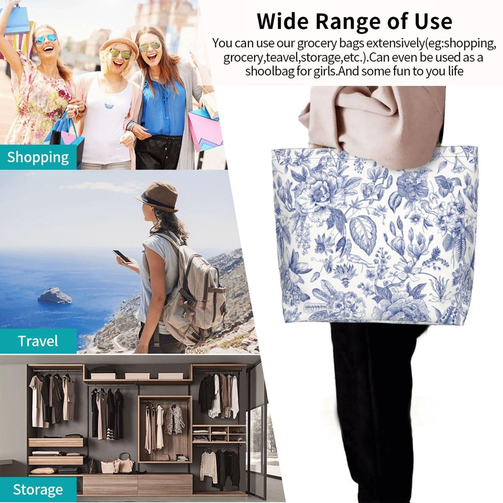 GVGOAGL Flower Blue White Leaves Tote Bag For Women, Large Waterproof Shoulder Bags Big Foldable Reusable Grocery Handbag For Travel Shopping Gym Sport Picnic Work Beach