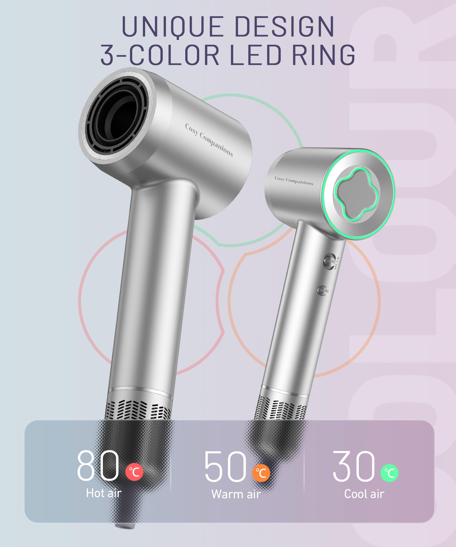 - Intelligent Temperature Control: Cosy Companions hairdryer measures the air temperature over 100 times per second and regulates the heat through a high performance chip control system. Avoid overheating damage to your hair and protect your hair. Our hair dryer has 3 different LED lights built in, and you can turn the LEDs into different colors by switching the heat button. Red means hot air, orange is warm air and green is cool air. Enjoy blow-drying your hair in comfort