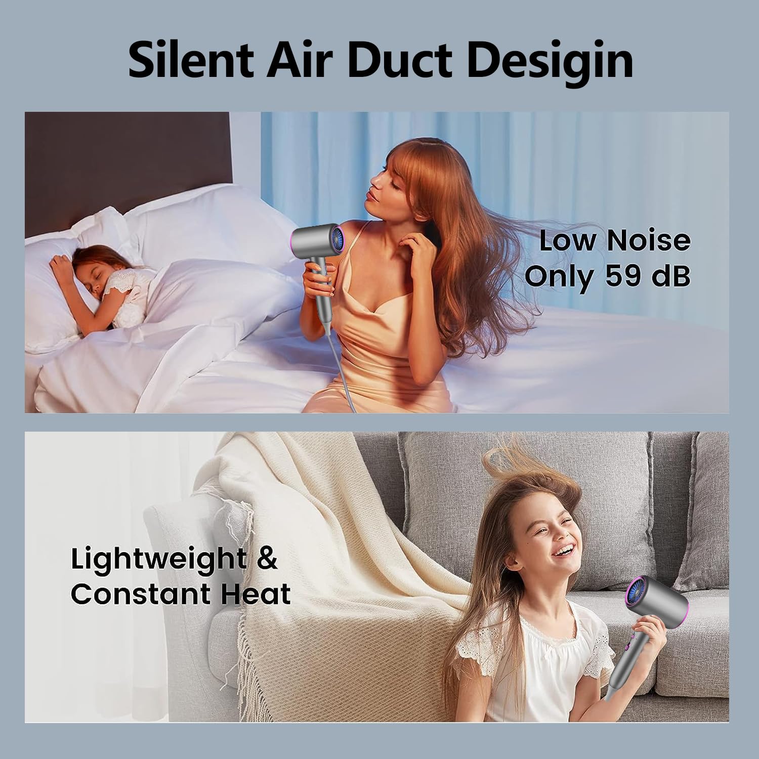 - Portable and Quiet:Compact and ultra lightweight design are perfect for travel,easy storage in your bathroom, bedroom, or vanity.The size of hair dryer woem men 4.72 x 3.07 x 11.41 inch.59dB offering a quiet and efficient drying experience.