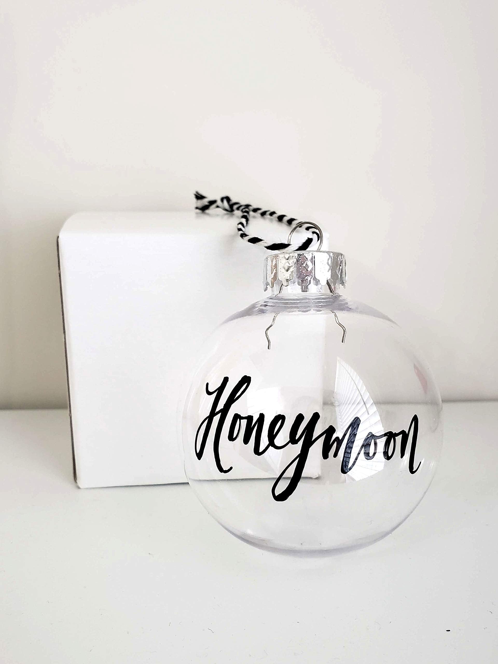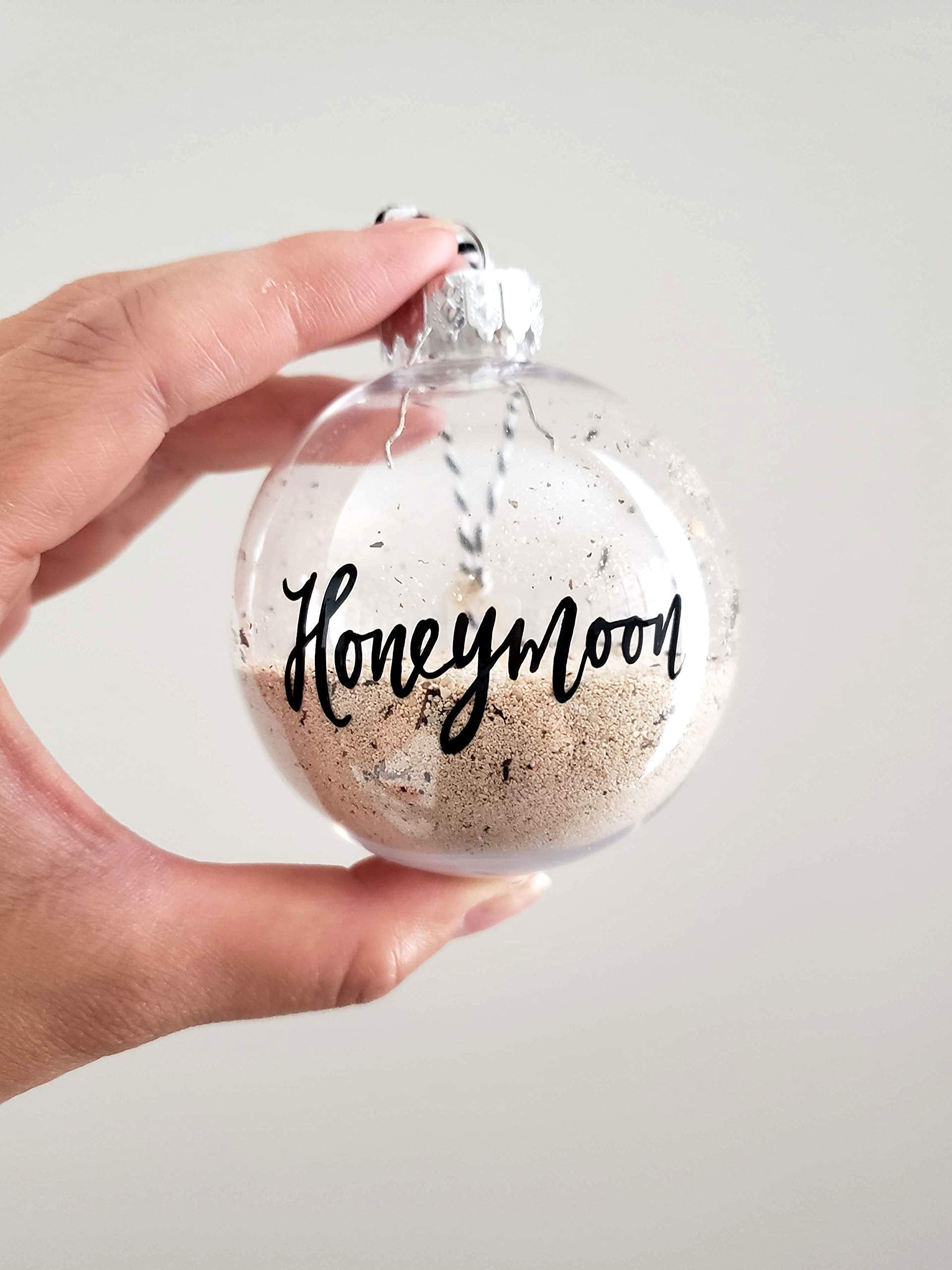 Details: Keep a little memory from your Honeymoon Vacation this December by storing beach sand in this Christmas Ornament. The word 'Honeymoon' is hand lettered onto the ornament in beautiful script calligraphy. Makes a great bridal shower gift for a newlywed! This is a small honeymoon sand ornament travel gift Measures 2.5 inches (64 mm) in Diameter Made of clear PLASTIC. This Christmas bauble is Shatterproof to avoid any messy breaks. Itentionally Lightweight so the beach sand does not weigh this honeymoon ornament down. The Silver Cap can be removed for you to insert your own vacation sand. Honeymoon Ornament opening is 15mm Sand is NOT included "Honeymoon" is hand lettered in black ink. Yes, we do individually hand letter each one and produce this item in small batches! Includes Black & White baker's twine string for hanging Perfect Newlywed Christmas Ornament for a Just Married Bride & Groom Includes white gift box