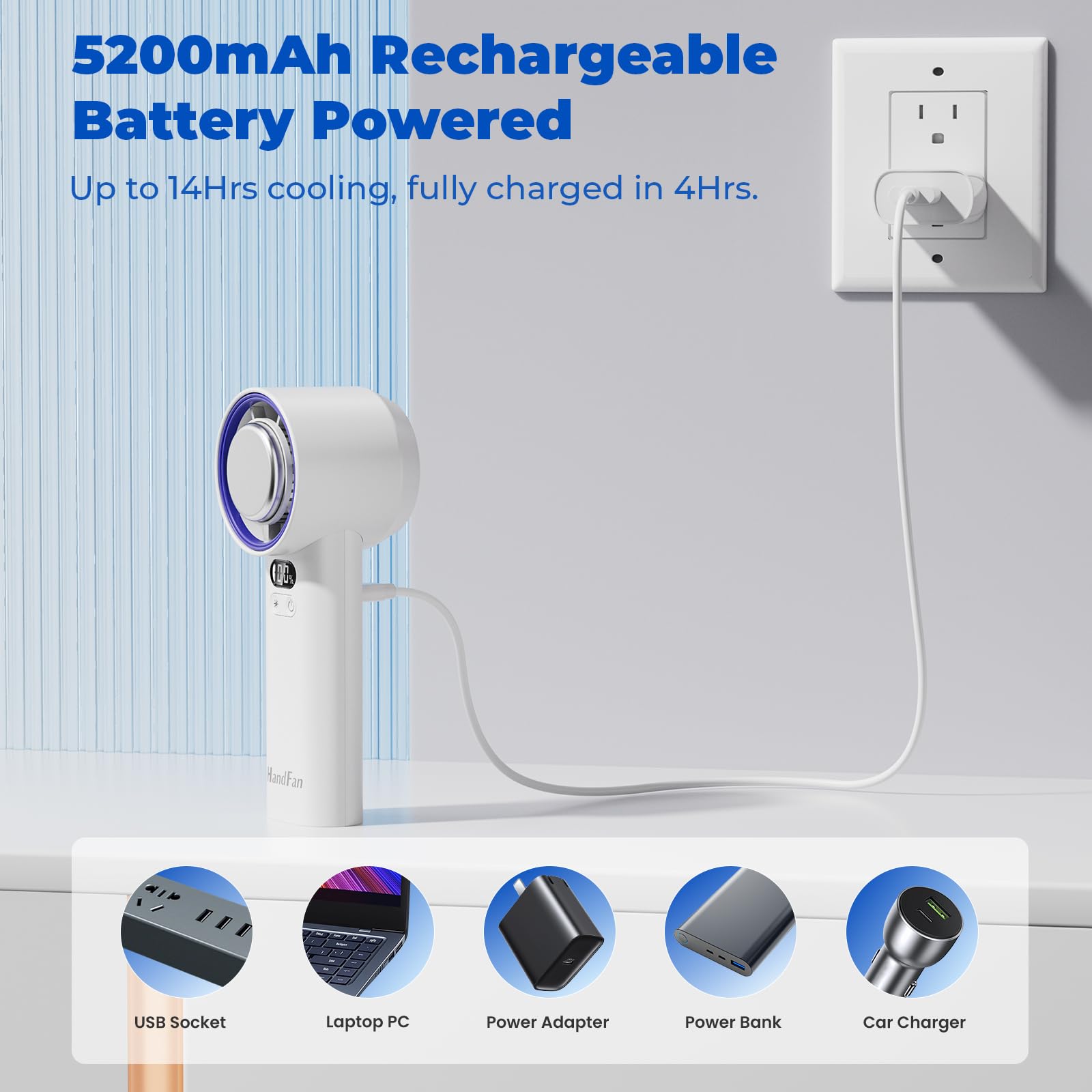 HandFan 5200mAh Portable Handheld Turbo Fan, 13000RPM Powerful Cooling Ice Fan, Mini Hand Fan Rechargeable, 100 Speeds Adjustable, Digital Display, Pocket Fans for Travel Beach Outdoors(White)