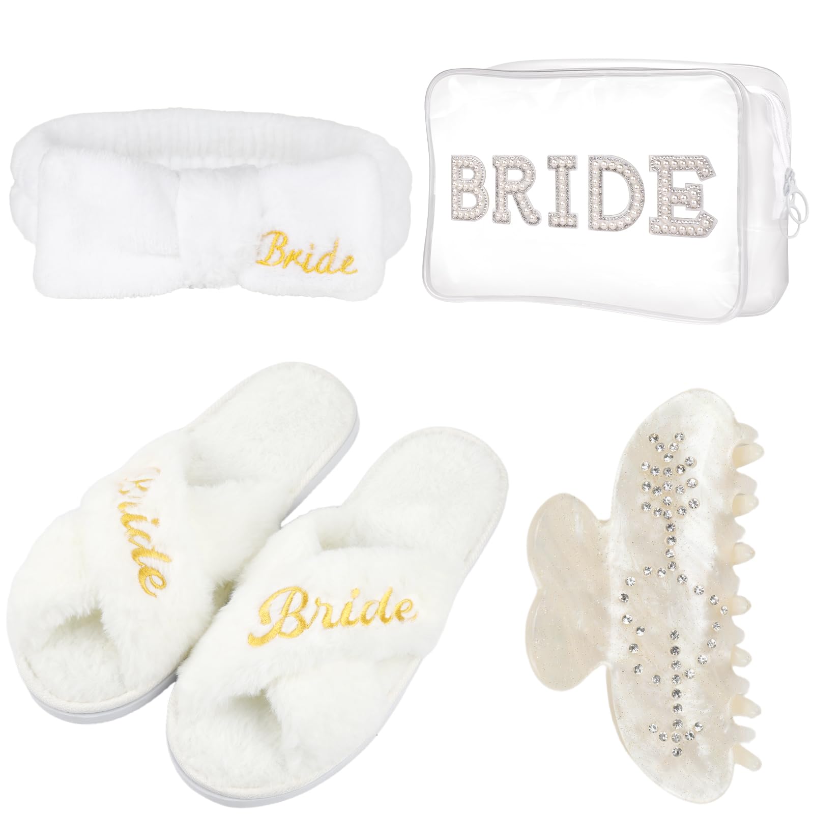 - 【Cost-effective set】:This Bride to be gifts set includes a hair band, a pair of slippers, a makeup bag, and a hair clip. Four versatile and inexpensive bridal gifts are not only affordable, but they are perfect companions for the bride's wedding day, bridal shower, bachelorette party or honeymoon, making them a practical gift for the bride to be.