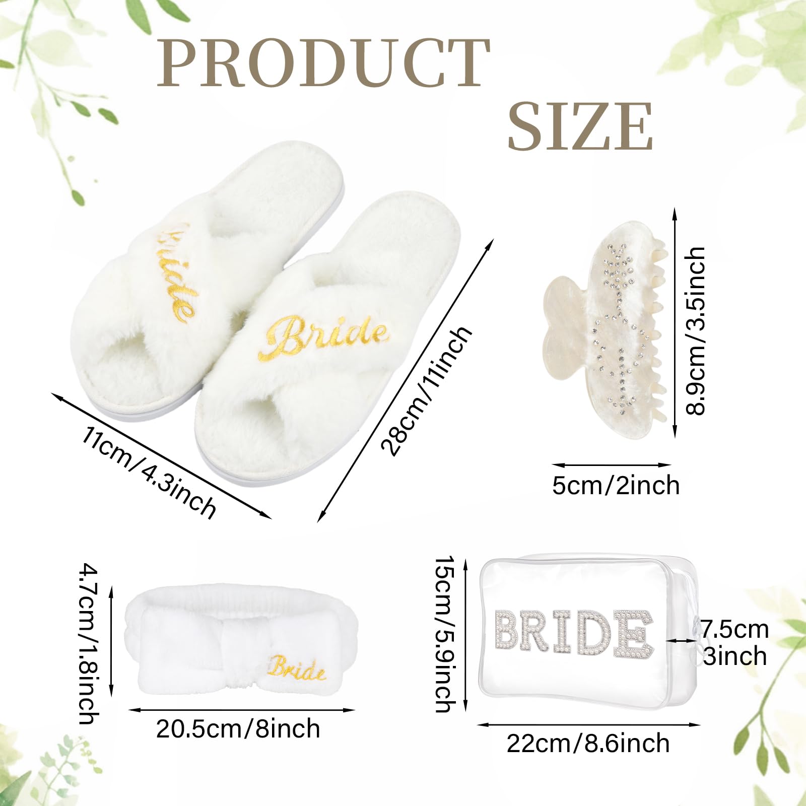 - 【Premium Materials】:Our 4pcs bridal gifts are made of high-quality materials.Crafted for comfort and durability, the coral fleece hair band feels soft against the hair without causing damage. The makeup bag, made of waterproof PVC, safeguards cosmetics from spills. The slippers, also in coral fleece, feature a non-slip sole for safety. Plastic hair clips have smooth edges for a firm grip.