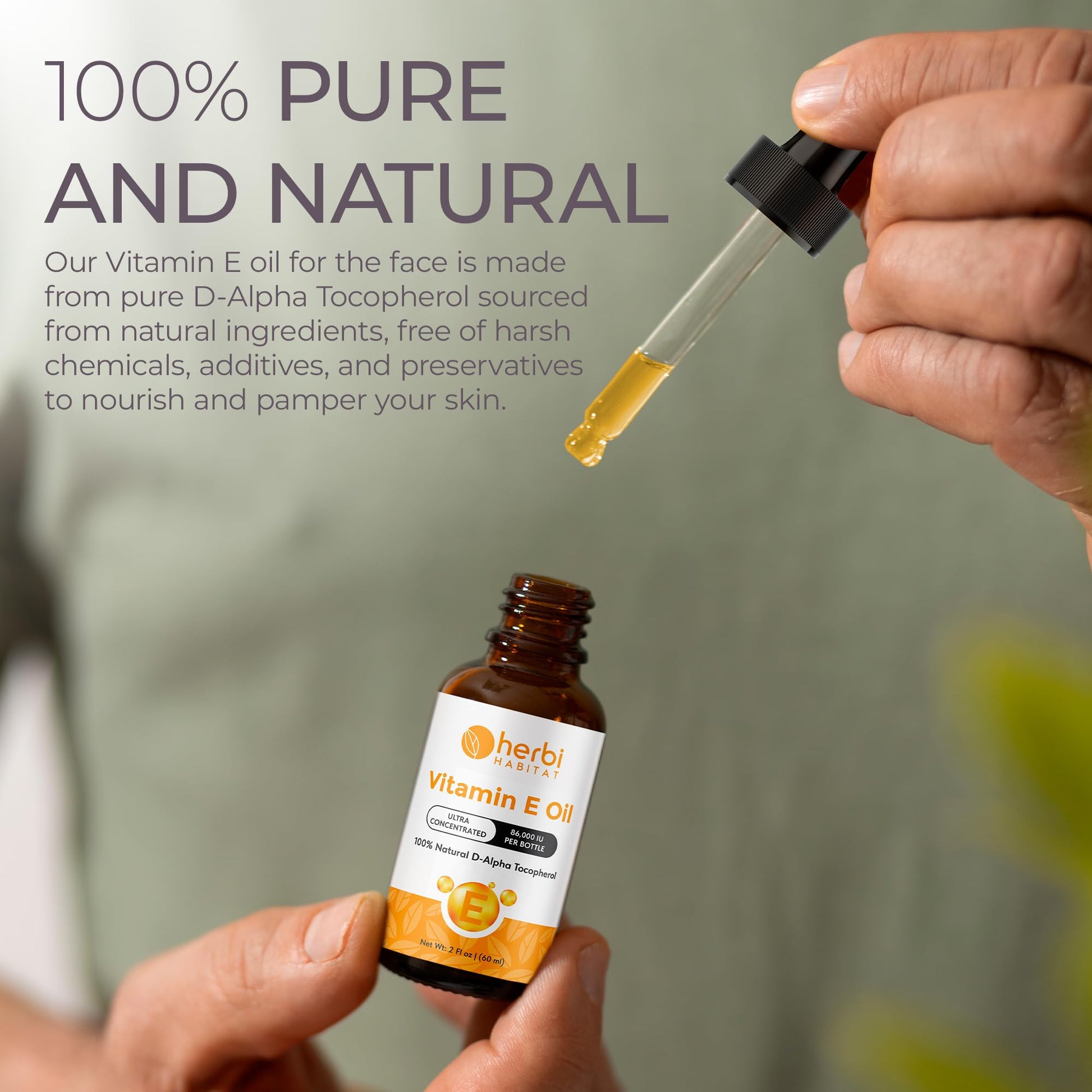 Herbi Habitat Vitamin E Oil 86,000 IU - Natural D-Alpha Tocopherol for Skin, Hair, Nails, Scars & Stretch Marks - Non-GMO & Vegan, 2 Fl oz