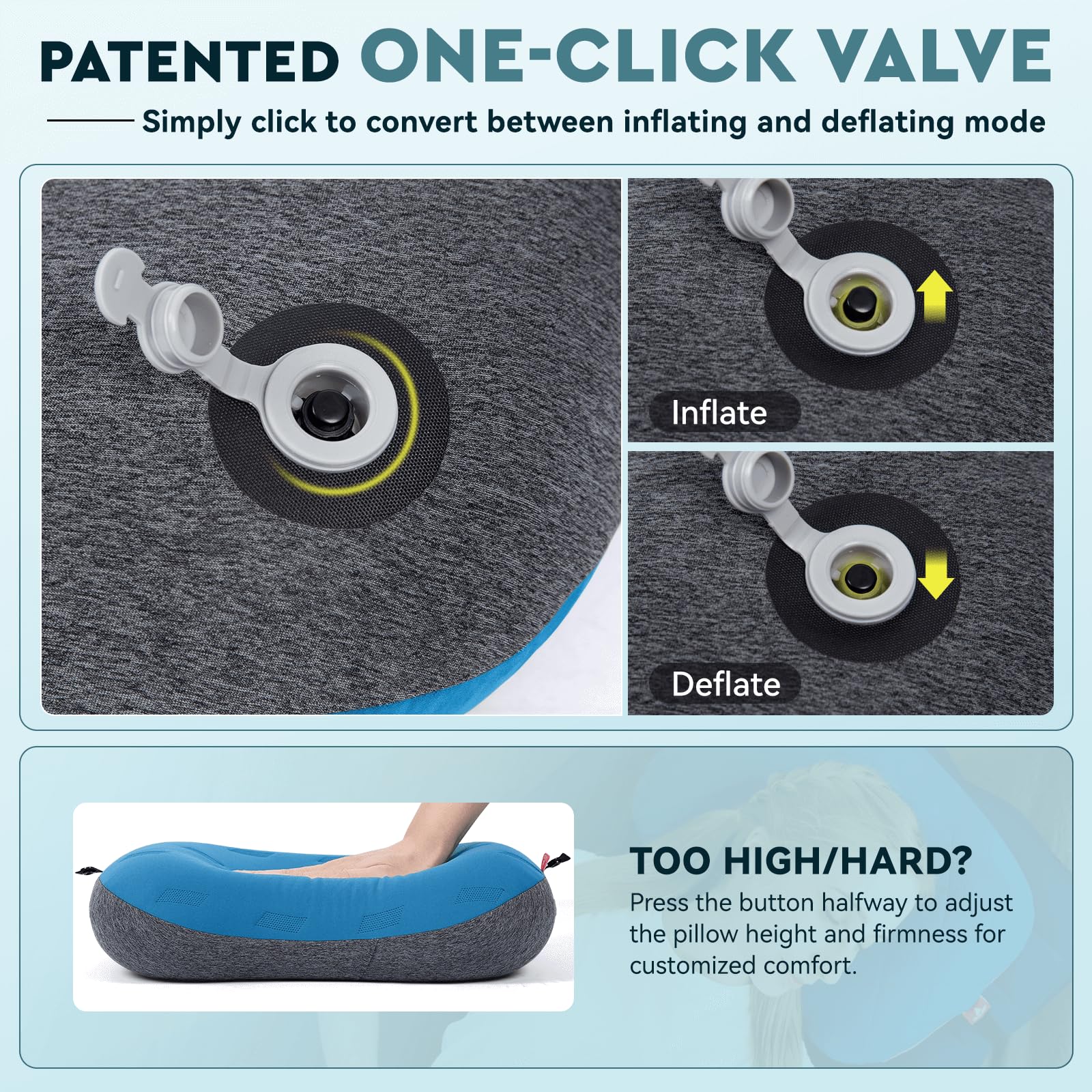 - ONE CLICK, ADVENTURE MADE SIMPLE - Simplify your camping setup with our sleeping bag pillow’s innovative one-click valve system, designed for effortless inflation and deflation. No more fumbling with complex mechanisms - adjust the compact travel pillow's firmness with a simple press of a button, and focus on what truly matters: enjoying the great outdoors. Efficiency meets convenience with our intuitive design!