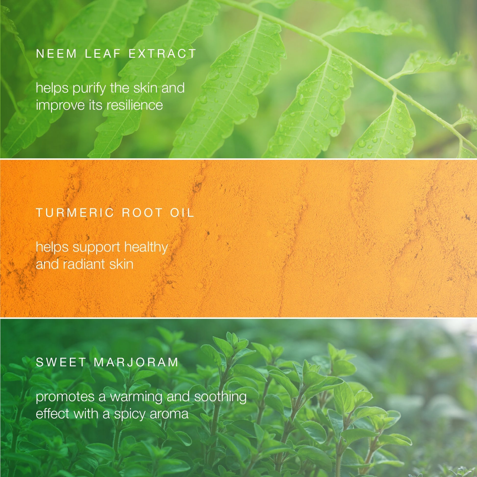 - Botanical Ingredients: With Neem, traditionally used to for cleaning and purifying oily skin; Turmeric to support clear, healthy-looking skin. With its rich, soap free lather, this herbal combo is ideal for waking you up in the morning or helping you wash away the day at night.