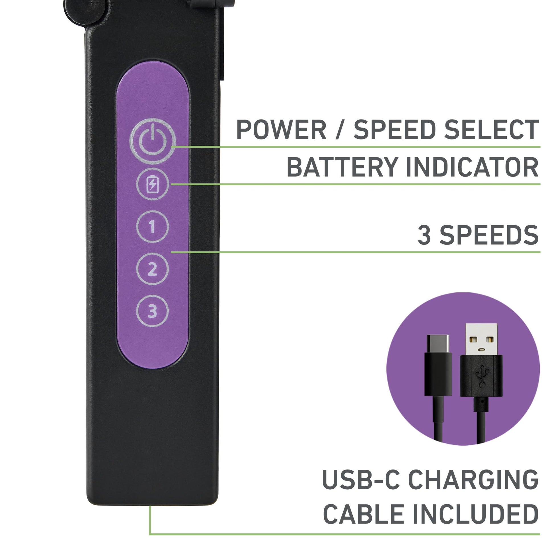 - 3-Speeds & 6 Purple Blades: Easily adjust airflow with three speeds—low, medium, and high—using the simple control panel. The 6 blades deliver efficient and powerful cooling for a personalized experience.