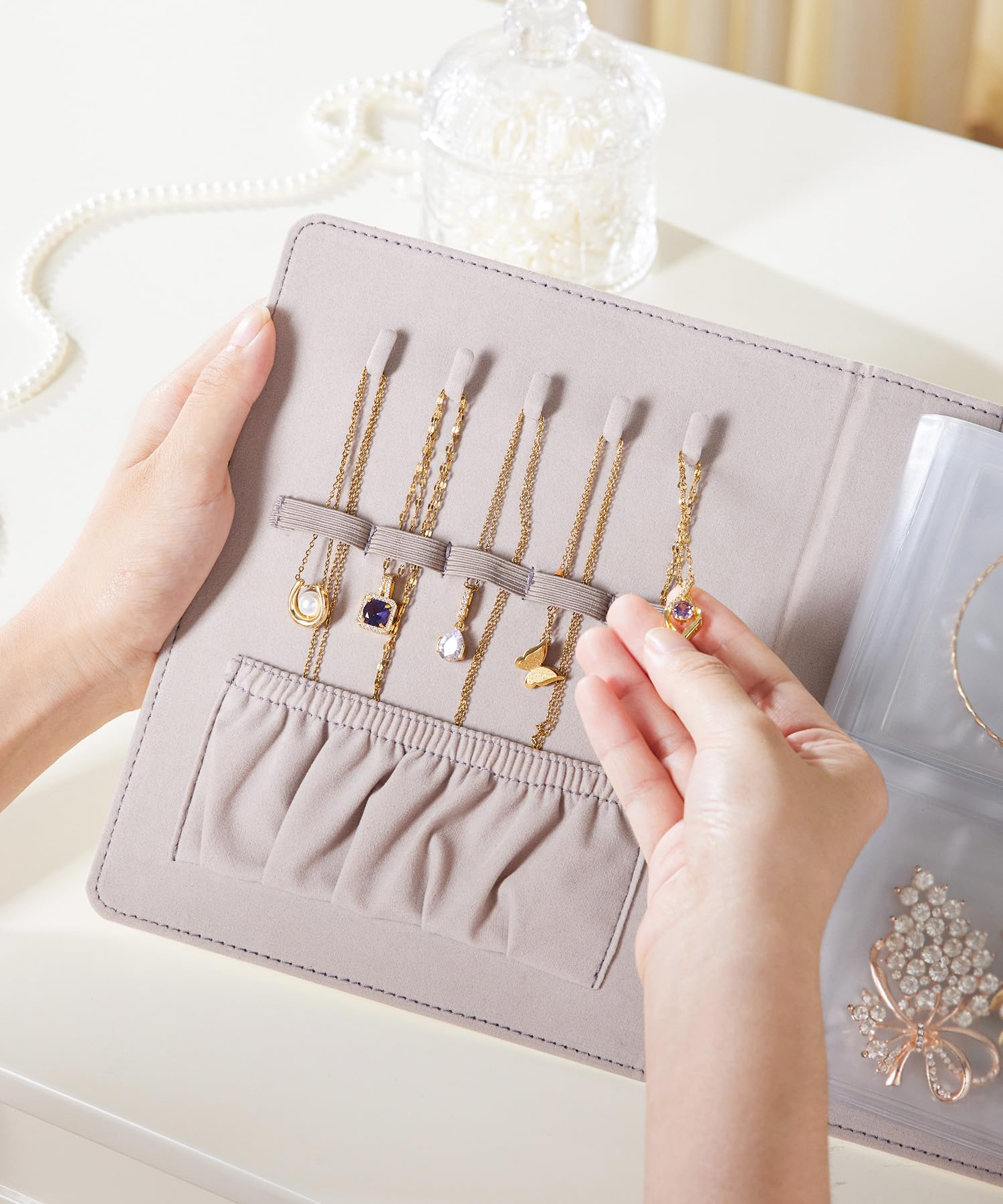 - Thoughtful Organizing Design: With 6 inner pages and a total of 18 compartments of various sizes, along with 18 corresponding PVC pouches, this organizer offers ample space to neatly store all your jewelry items. The top necklace hook, elastic straps, and a small pocket are specifically designed to prevent necklaces from tangling, keeping them in perfect condition. Whether you're organizing your daily essentials or packing for a special occasion, this organizer makes it easy to find and access your jewelry