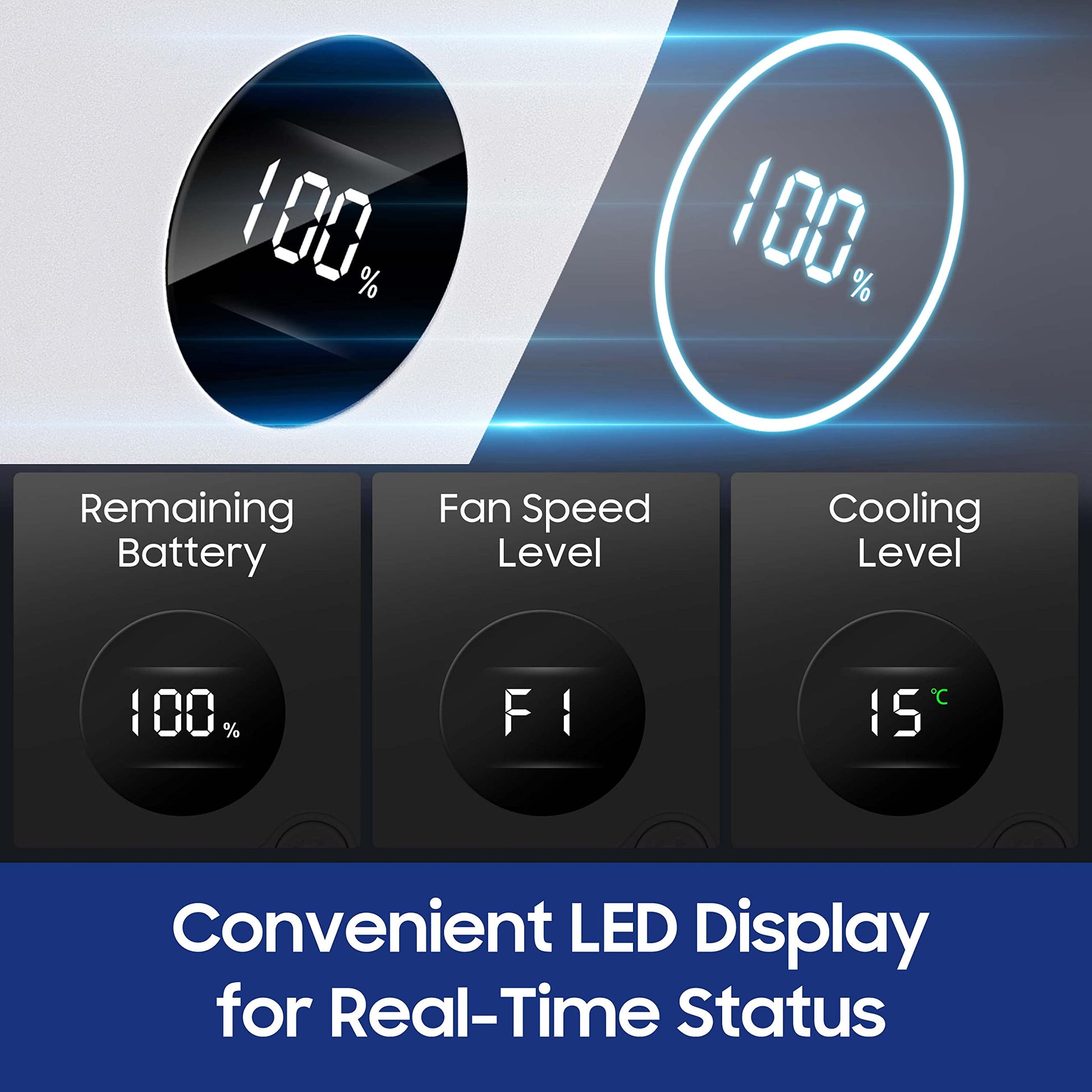 - EASY TO USE: The LED display shows the battery level, fan speed and cooling level, making it effortless to know the status of your personal cooling device. Easily control your fan speed and cooling level from your cooling neck fan with the convenient buttons on the fan