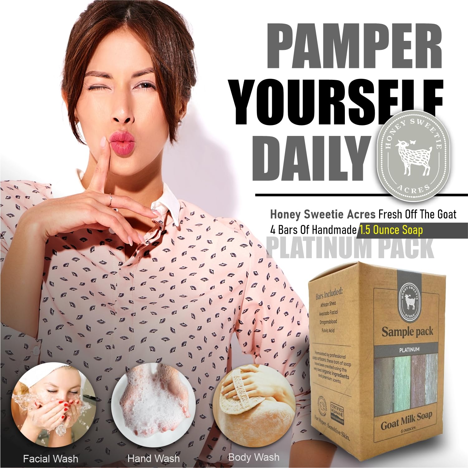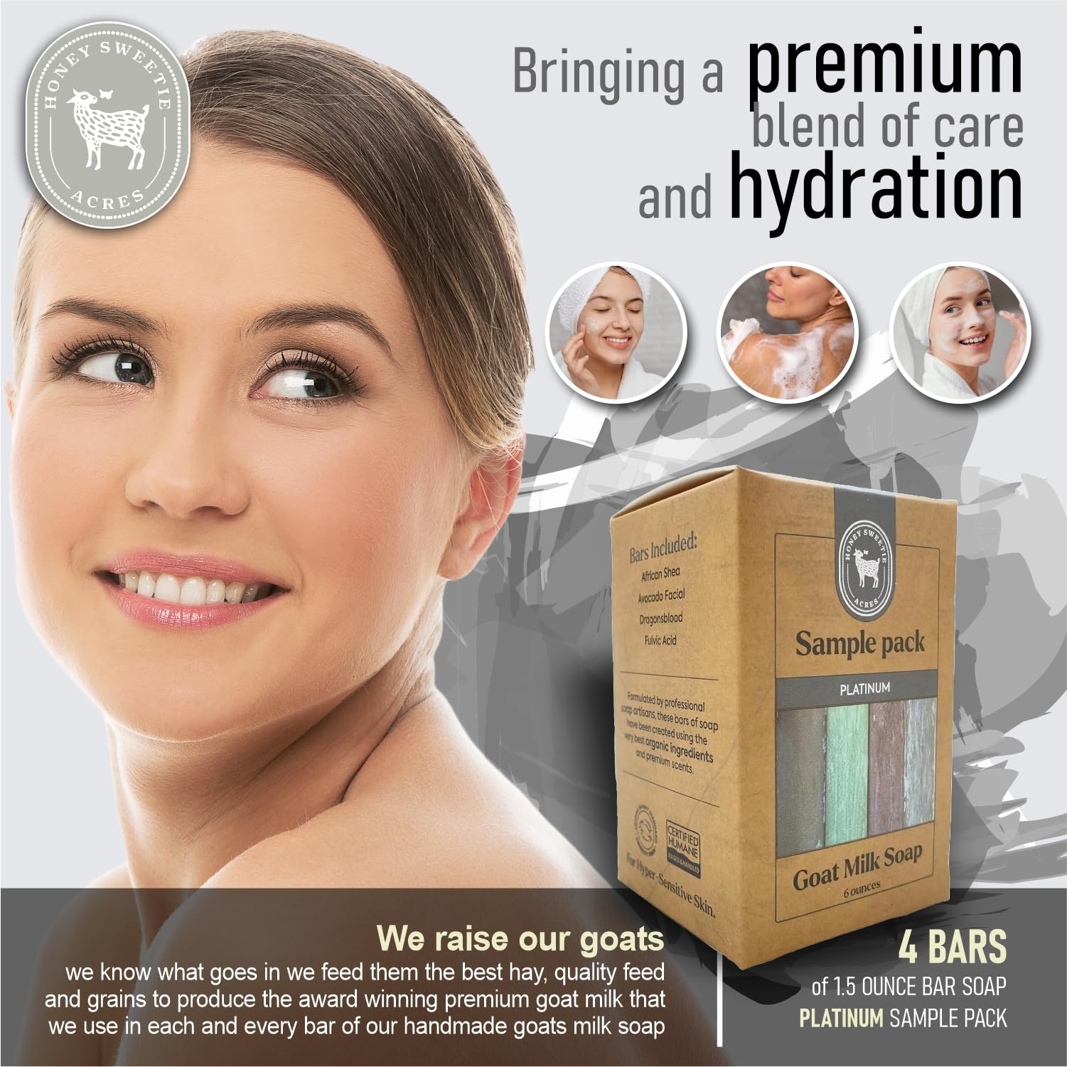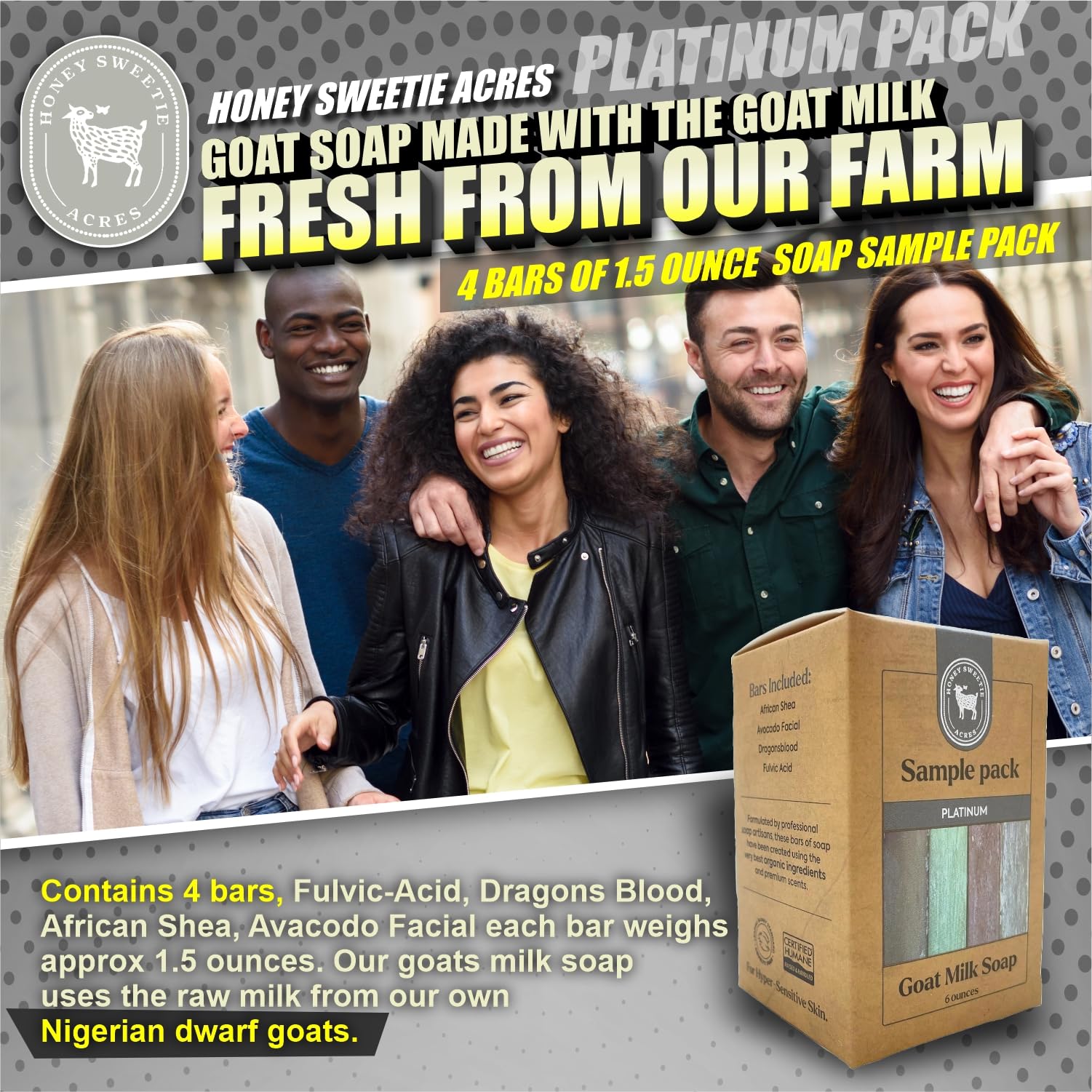 - Includes 4 Bars: Fulvic Acid, Dragon’s Blood, African Shea, and Avocado Facial. Each bar weighs approximately 1.5 oz. Made with fresh goat milk from Nigerian Dwarf goats.