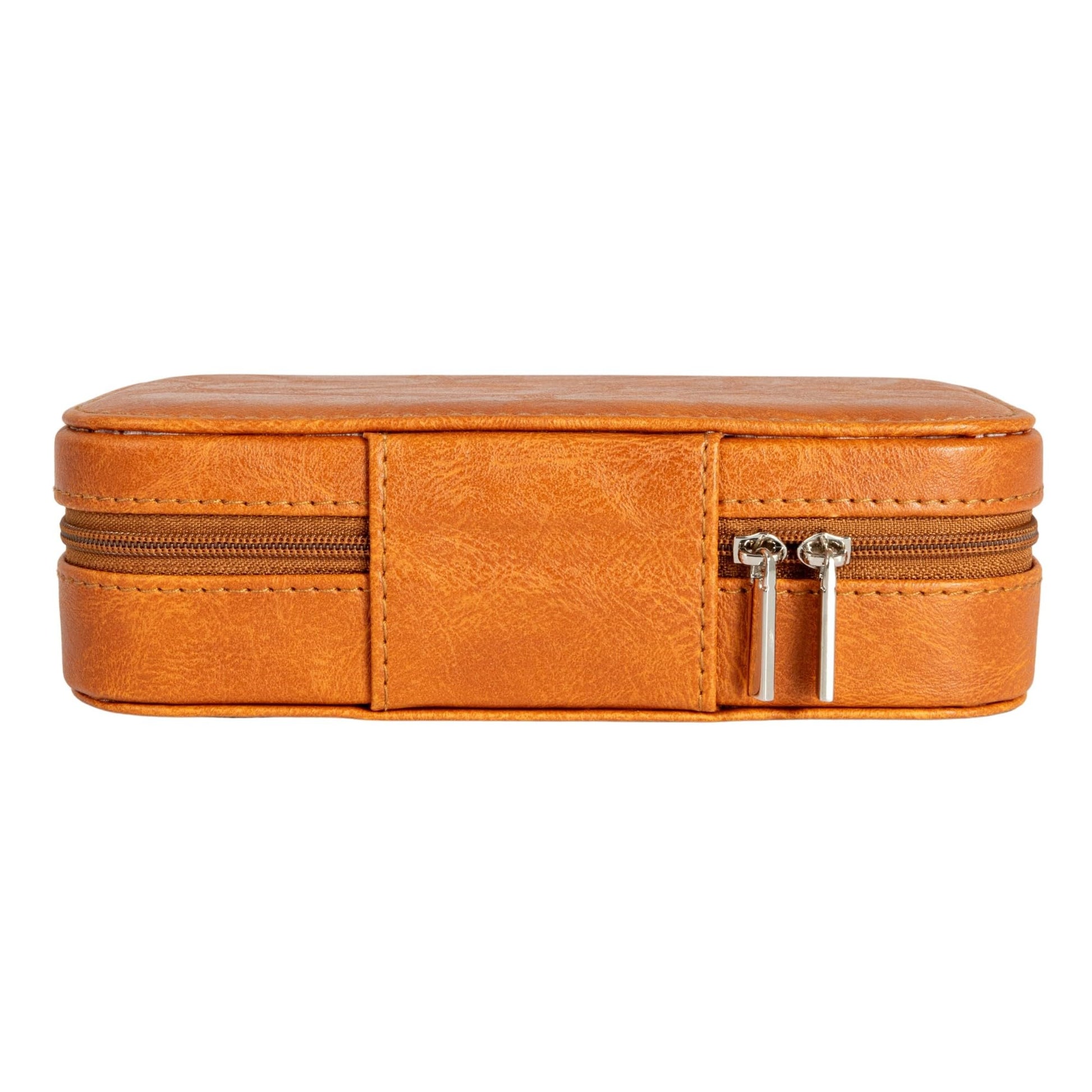 Details: This petite and elegant jewelry case features a caramel faux leather exterior with zipper closure and a gentle polyester interior. It is a stylish and convenient way to store and protect jewelry while traveling or at home. The jewelry case has rounded corners and a compact size, measuring 7 inches in length, 4 inches in width, and 2 inches in height. With compartments and tabs to hold rings, earrings, necklaces, bracelets, and other small accessories, the jewelry box is compact enough to slip inside your purse while on the go, or leave at home to organize your jewlery pieces. Made with vegan leather it has a smooth, rich finish adding a touch of luxury and sophistication. Thoughtfully designed this makes a great gift for Mother's Day, Anniversary, or Birthday.