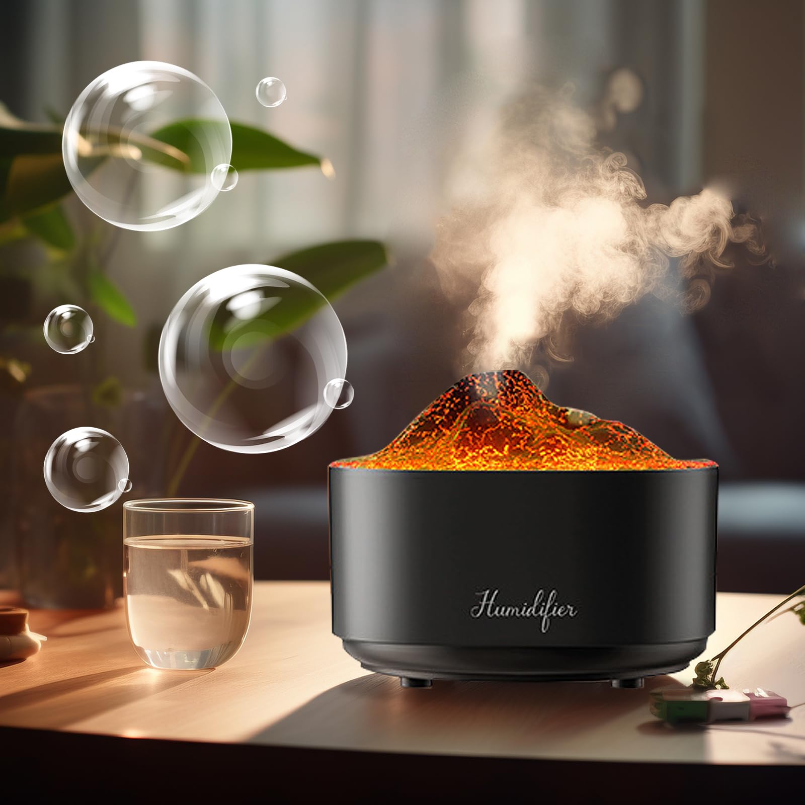 Humidifier for Bedroom,1.5L Volcano Essential Oil Diffuser,Air Diffuser with Premium Flame Lights Dual Nozzle Design, Auto Shut-Off USB Desk Humidifier, Ultra-Silent for Bedroom Travel Office.