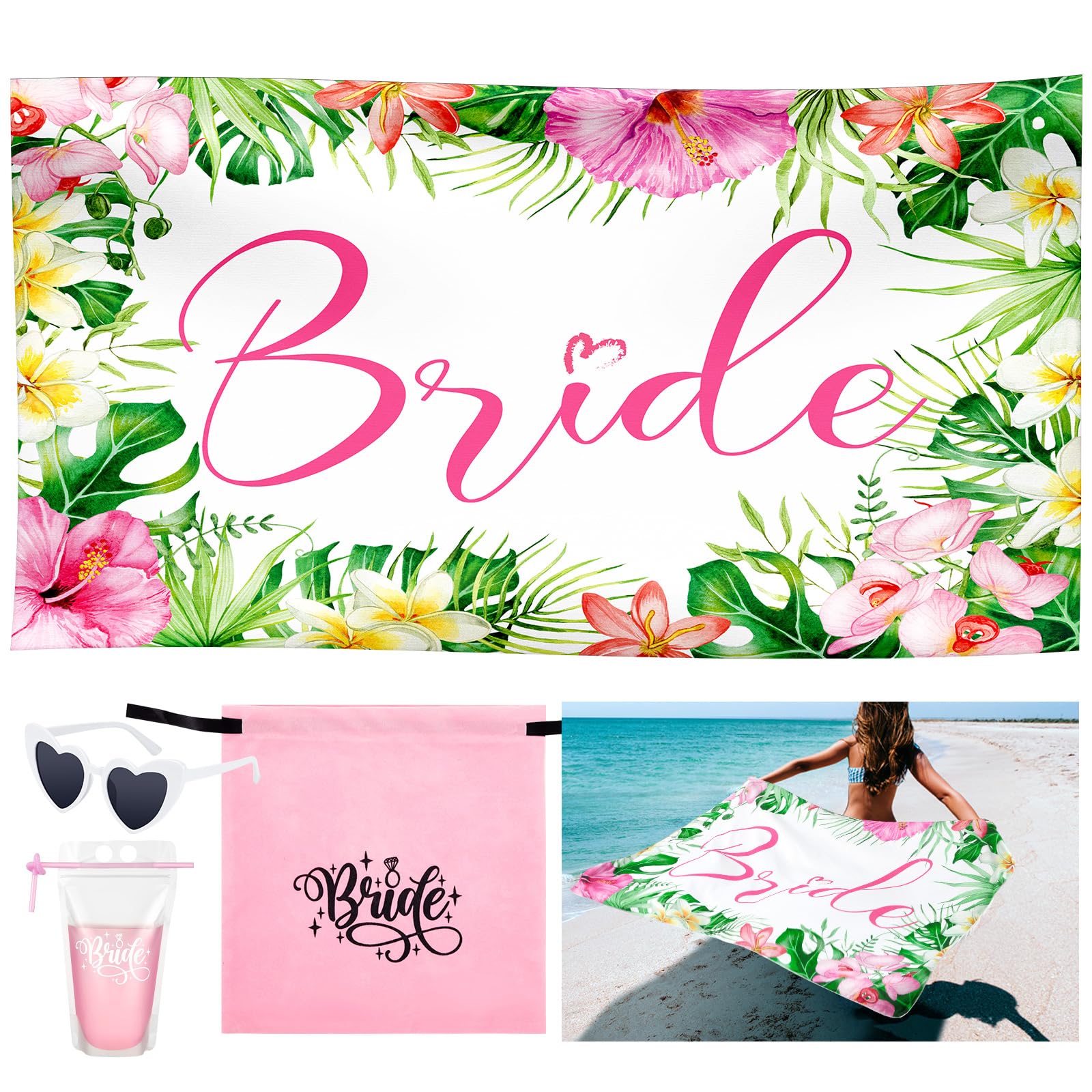 - Bride Beach Towel Set: with the inclusion of a bride beach towel, a bride drink pouch with straw that can hold up to 17 oz of your favorite refreshment, a heart shaped sunglass that deliver both protection and style, and a spacious storage bag measuring around 11.81 x 11.42 inches, this set provides ideal convenience; Every component of the set serves a useful and stylish purpose