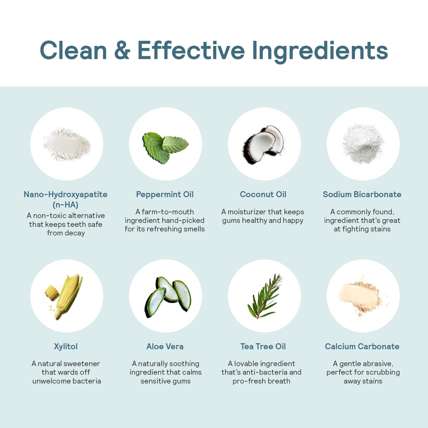 - NANO-HYDROXYAPATITE TOOTHPASTE TABLETS: Our toothpaste tablets include a revolutionary ingredient called Nano-hydroxyapatite (or N-HA, for short). This is a fluoride alternative that provides natural remineralization, protection against sensitivity, prevention of cavities and enhanced whitening for a beautiful and bright smile.
